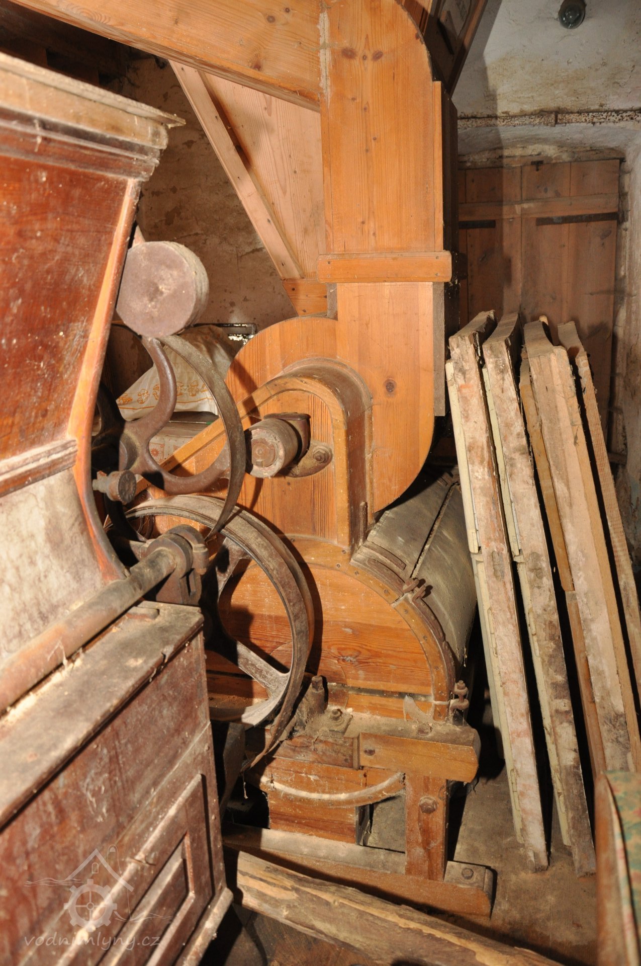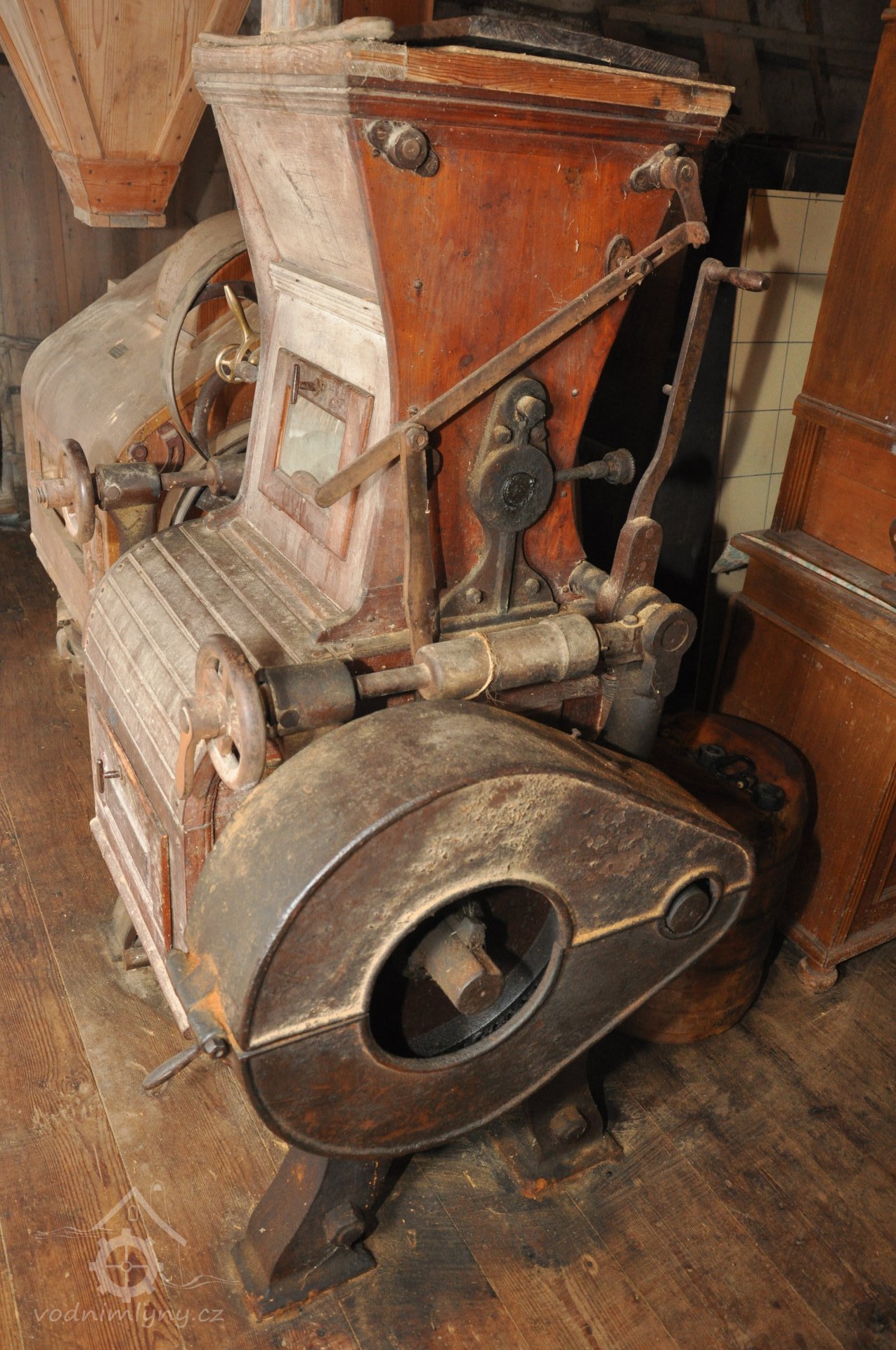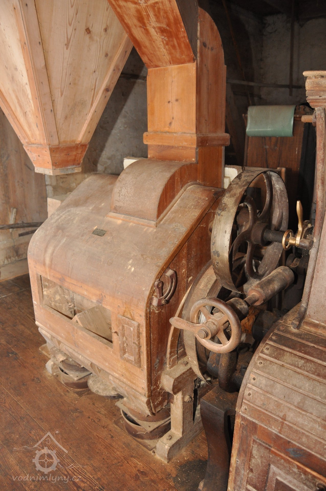 - Na prvním podlaží stojí velmi vzácně dochovaná válcová mlecí stolice (rýhované válce v dřevěné skříni) od firmy Karel Závodský - Želetava. Tento stroj starého konstrukčního systému byl vyroben mezi roky 1888 až 1890, do mlýna byl pravděpodobně osazen ale až později. Vedle válcové stolice je taktéž velmi vzácná průchodová loupačka od firmy Jindřich Světnička - Strměchy u Pelhřimova (pravděpodobně vyrobená mezi rokem 1915 až 1925). Dále se zde nachází kombinované filtrační zařízení od aspiratéru loupačky systému autokap/spirokap. V podstřeší dochován jeden hranolový předvysévač s demontovaným pravoúhlým převodem, rozebrané kapsové dopravníky a uskladněno je i torzo velkého moučného hranolového vysévače (z rotoru někdo udělal stolek). Čistící hranolový vysévač bez dochovaného koukolníku lze spatřit v podkolí. Vysévače jsou pravděpodobně taktéž od firmy Jindřich Světnička - Strměchy u Pelhřimova. Krupičný stroj není dochován vůbec. David Veverka - sp. restaurátor starých strojů.