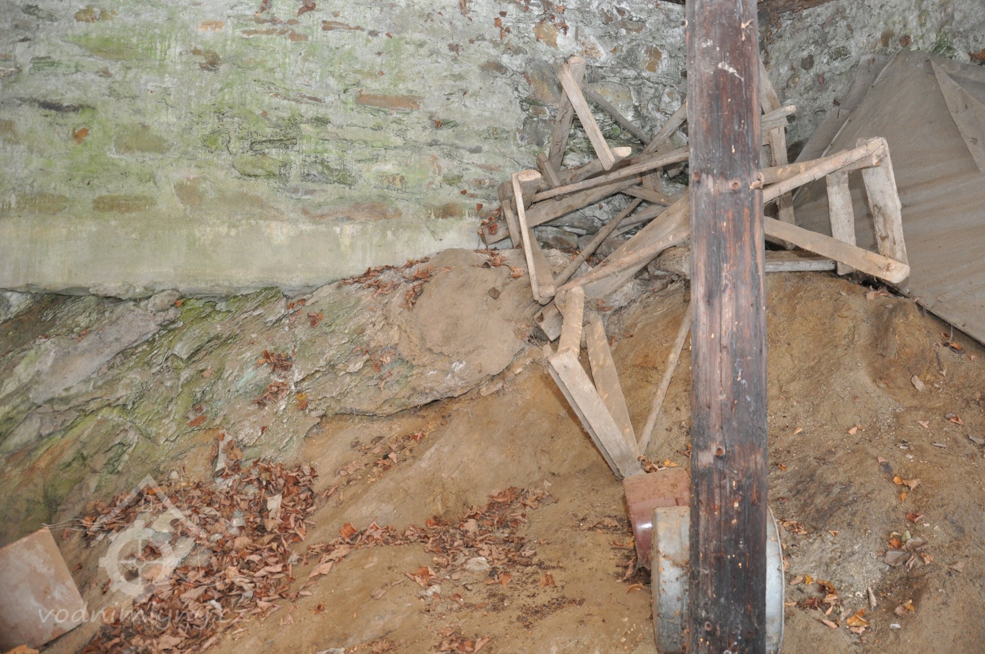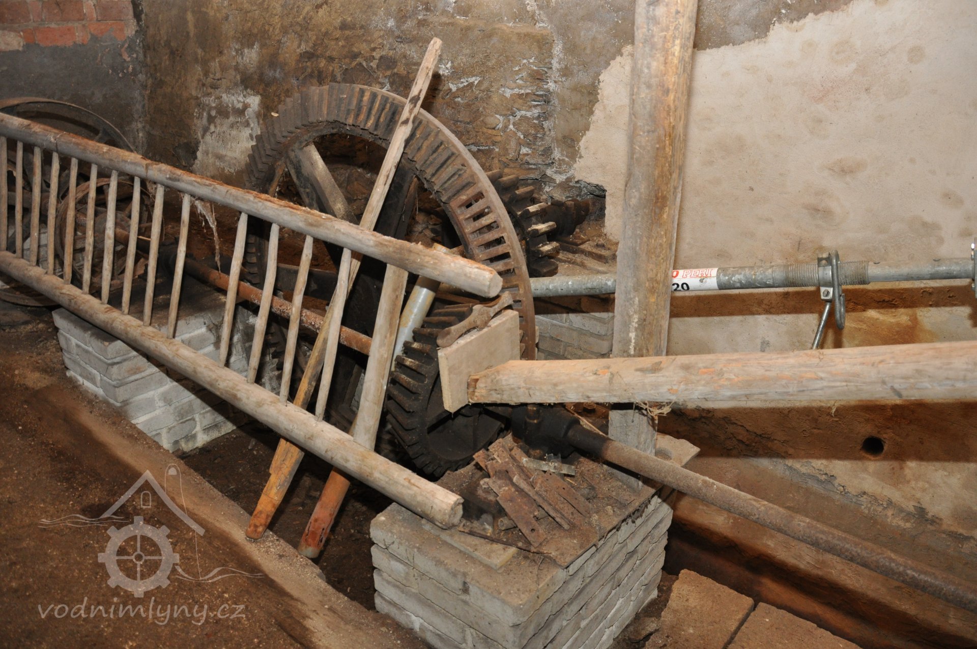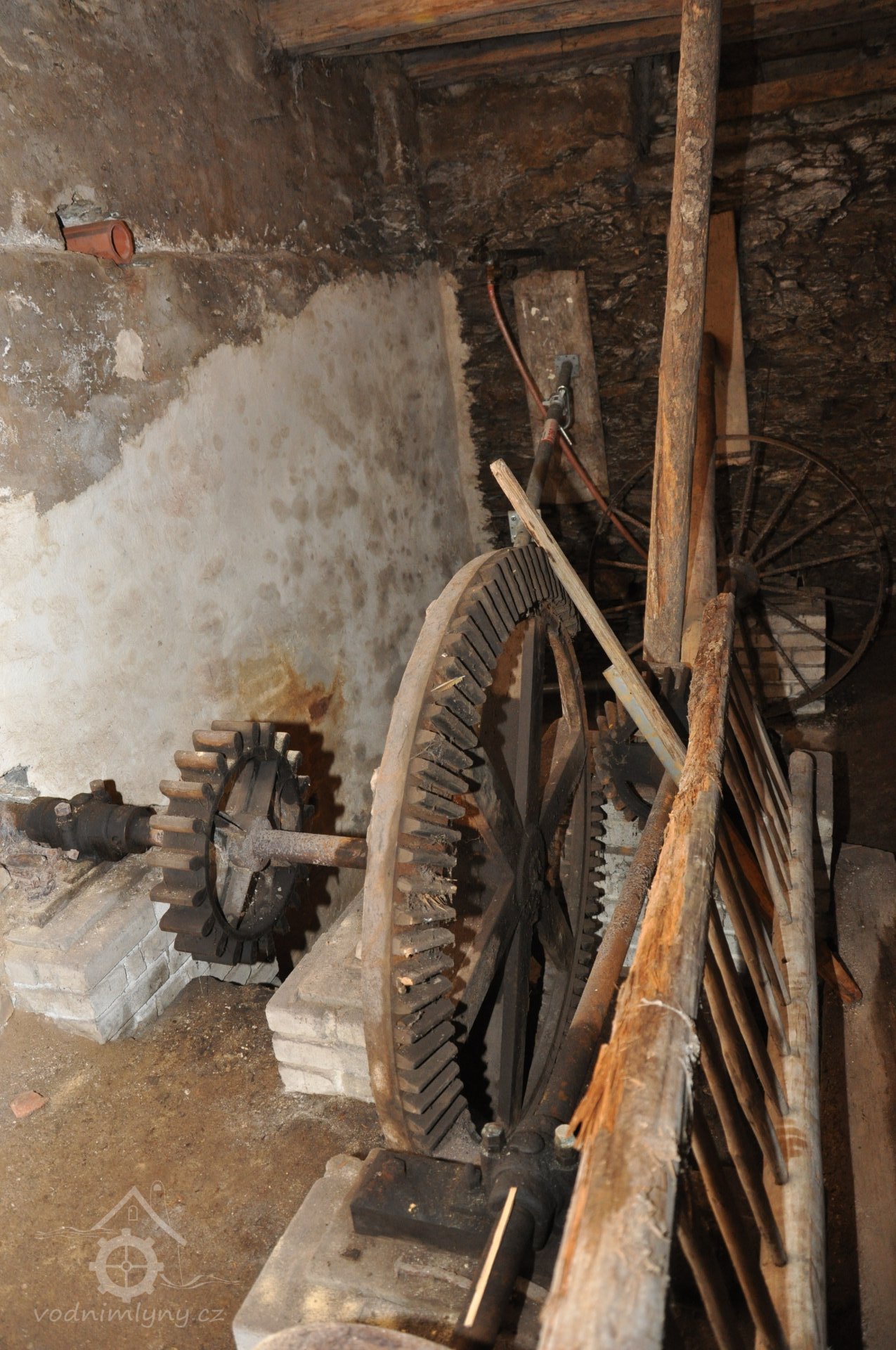 - V podkolí nachází se částečně dochovaný převod a transmise. Pracovalo zde celodřevěné vodní kolo na vrchní vodu osazené na dřevěné hřídeli, která otvorem procházela dovnitř mlýnice, osazená s kovovými čepy v kluzných ložiskách. Na dřevěné hřídeli bylo paleční kolo s čelními palci (tyto dřevěné části nedochovány, hřídelový otvor zazděn), palce tohoto kola zapadaly do pastorku na předlohové hřídeli, na které je osazeno litinové paleční kolo (s bočními palci), které tvoří s pastorkem na hlavní transmisi pravoúhlý převod. Na hlavní transmisi je několik litinových řemenic, hřídele jsou uloženy v ložiscích kroužkomazného systému.