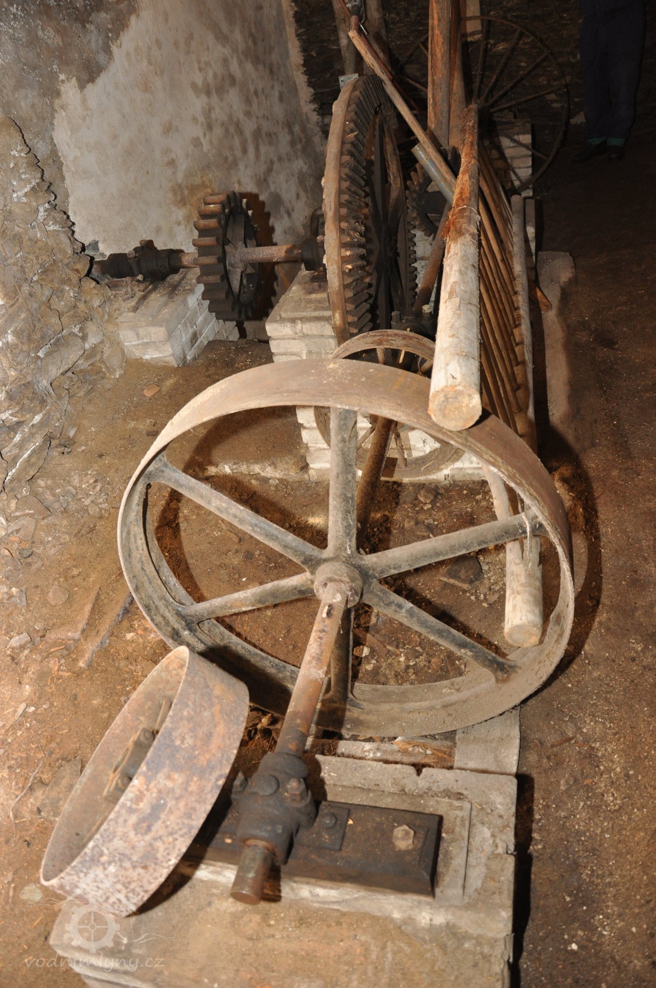 - Na transmisi v podstřeší je dřevěná kladka, která za pomoci lana jdoucího skrz střešní otvory (vzácně dochováno) roztáčela ještě malou transmisi ve stodole pohánějící mlátičku a další zemědělské stroje.