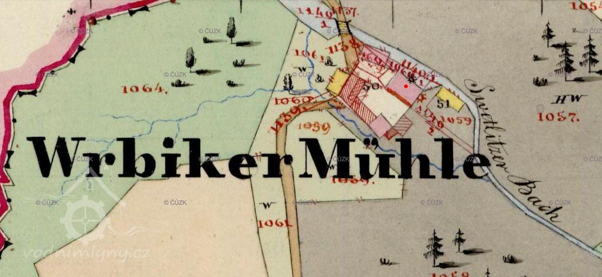 ...Na konci náhona jsou zřízeny vantroky 1,29 m široké a 0,59 m vysoké v délce 4,75 m. Pokračováním těchto starých vantrok je dřevěný žlab na počátku 94 cm a na konci 67 cm široky. Tímto žlabem pouští se voda do kolmé dřevěné roury jejíž půdorys je 50x80cm. Roura je ode dna 4 m vysoká, dole zkosená. Zkosený otvor je zabedněn deskami a až na část 5 cm čirokou se dá uzavřít dvoudílným stavítkem 50 a 30 cm širokým. Těmito stavítky se pouští voda na tzv. Peltonovo kolo.