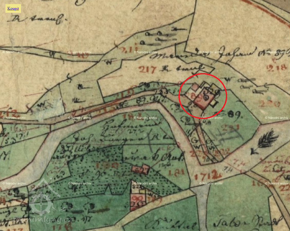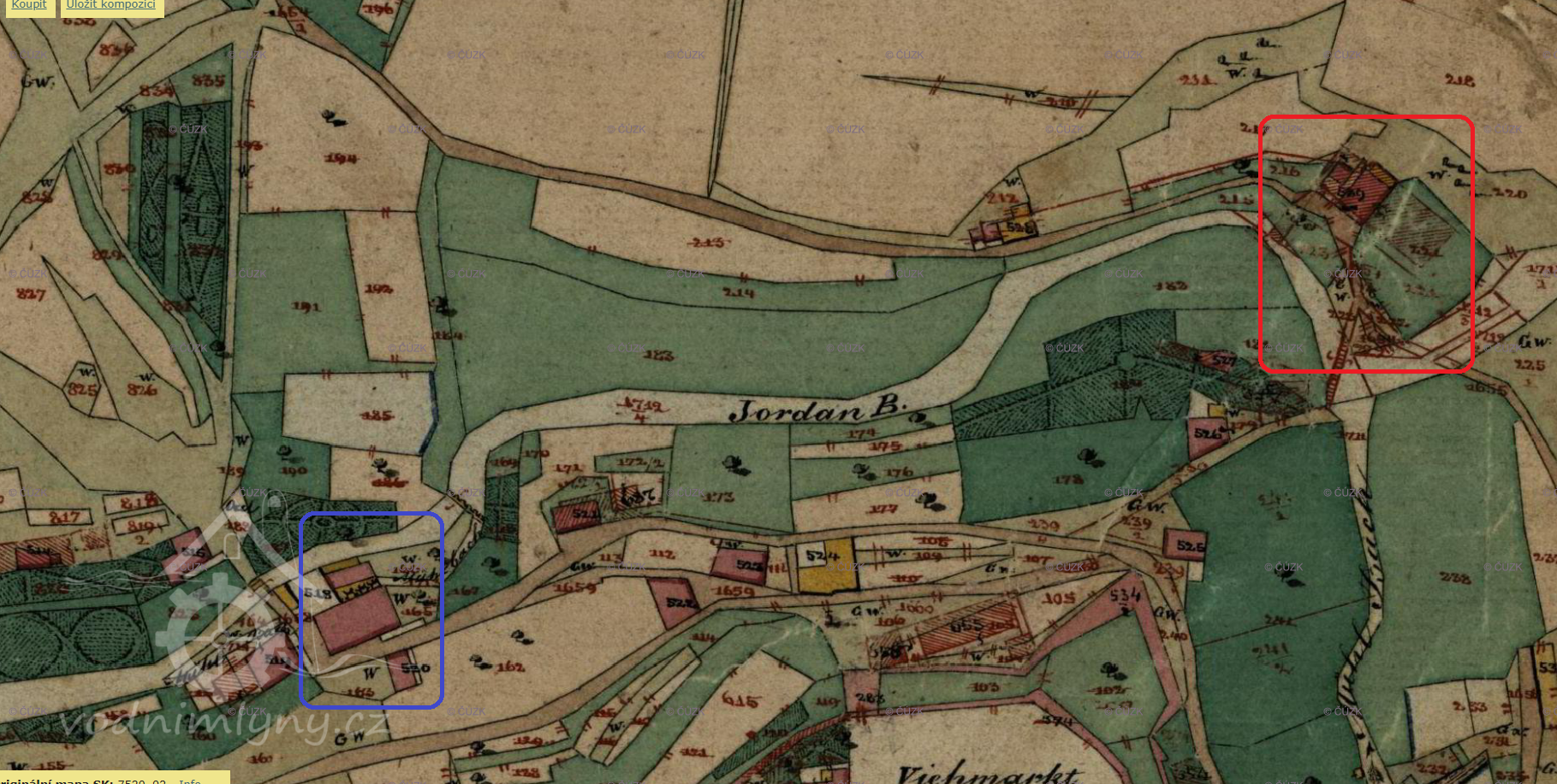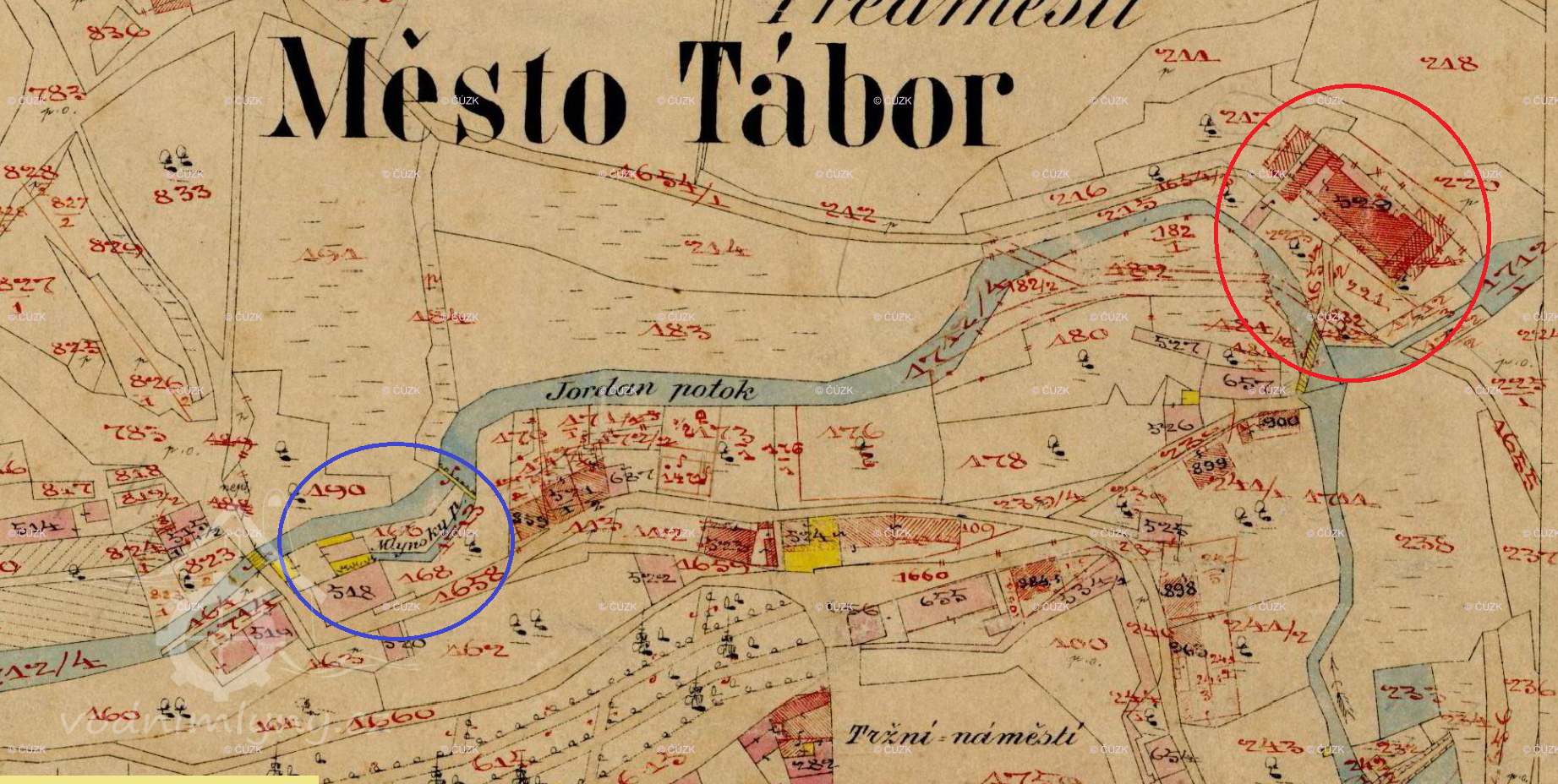 První mlýn pod hrází Jordánu, dosvědčený již k roku 1436, původně malý, koncem 19. stol. podstatně zvětšený, poč. 20. stol. ukončeno mletí a přestavěn na truhlářskou dílnu bez vodního pohonu. Dnes zařízení Českého rybářského svazu.