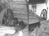 2) prům. 2,56 m, šířka mezi věnci 85 cm, hloubka korečků 0,25 m, max. hltnost 74 l/s, 8 ot. min, spád 3,91 m, max. výkon 2,2 HP (pohání dmychadlo, stříhací stroj, hospodářské stroje a dynamo pro vlastní potřebu)