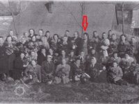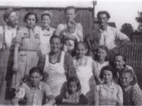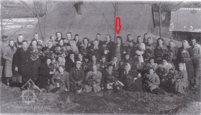 Anna Mikulíková mezi pracovnicemi strašické provozovny Oděvy při oslavě MDŽ na farní zahradě., 50. léta 20. stol., © Otakar Mikulík
