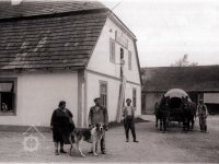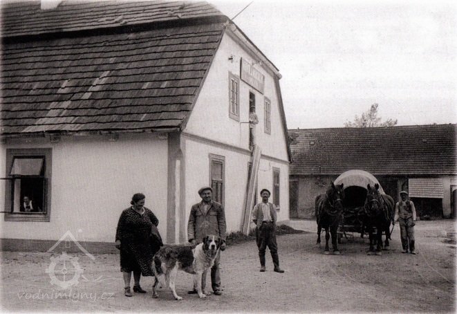 zleva Anna Mikulíková, jejich pes Baryk, mlynář Josef Mikulík a stárek František Huml., 1928, © Archiv Lubomíra Mikulíka.