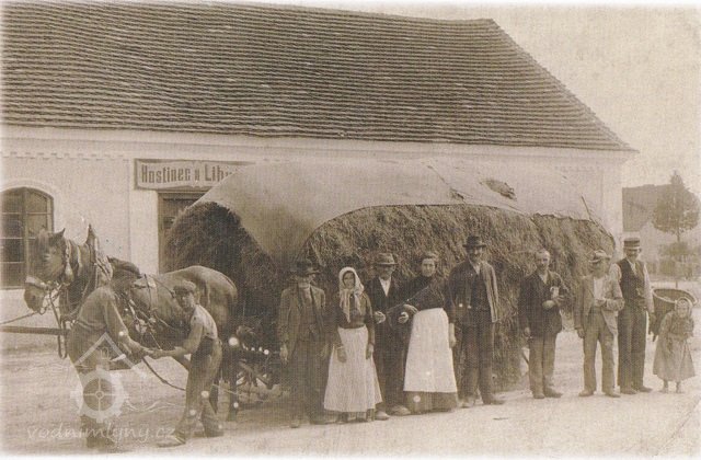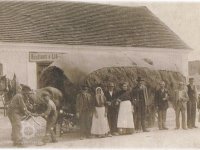 Mlácení obilí. Třetí zleva je mlynář Jan Hájek. Na schodech sedící je syn Vilém., 1925, © Foto Ing. František Hájek. Archiv Bohumily Hájkové.