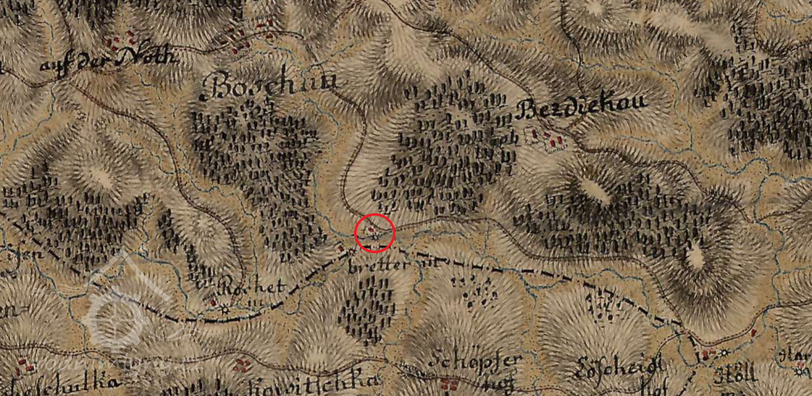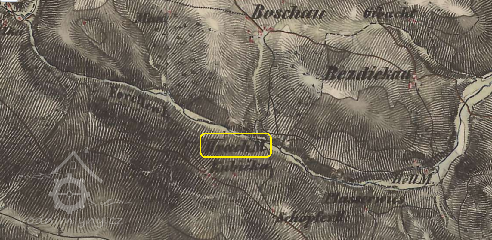 Bošovský/Hrachův mlýn je zakreslen již v 1.vojenském (josefském) mapování z let 1764-1768.