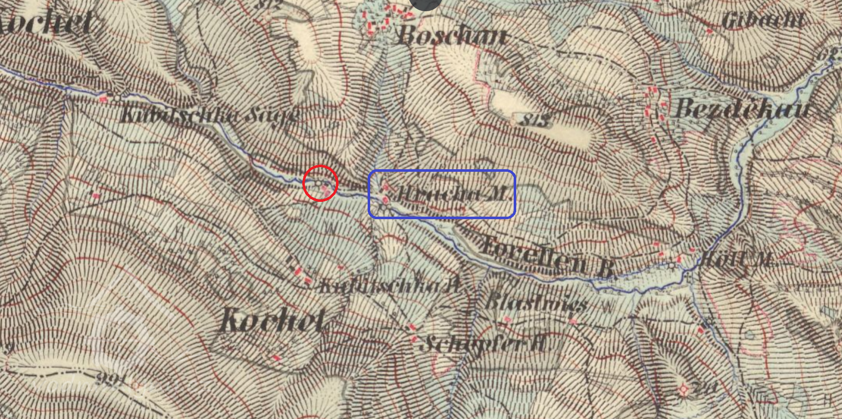 Souhrnně byly označovány jako"Rusticalchaluppe und Mahlmühle Nc. 23 in Boschau".