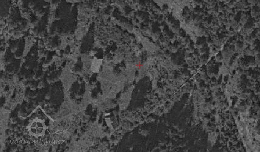 V r. 1959 stály ještě dvě budovy, mlýnice již nebyla.
