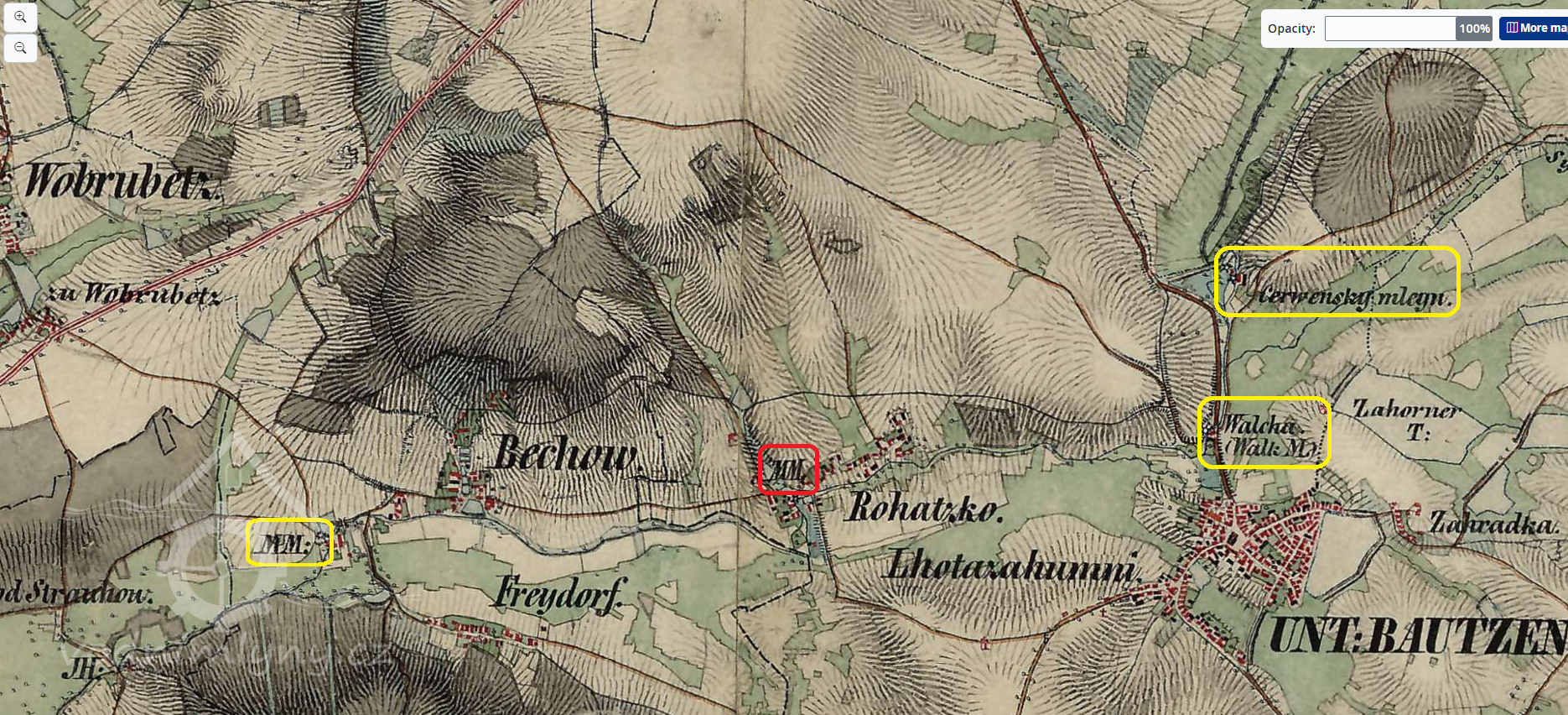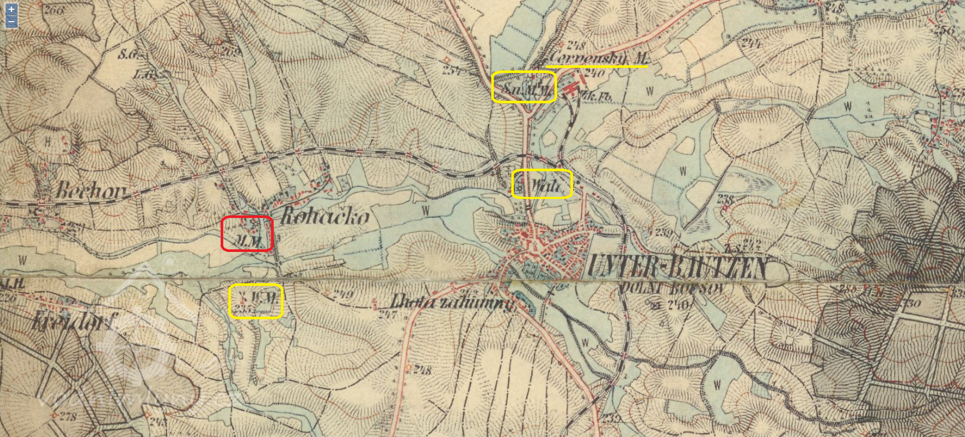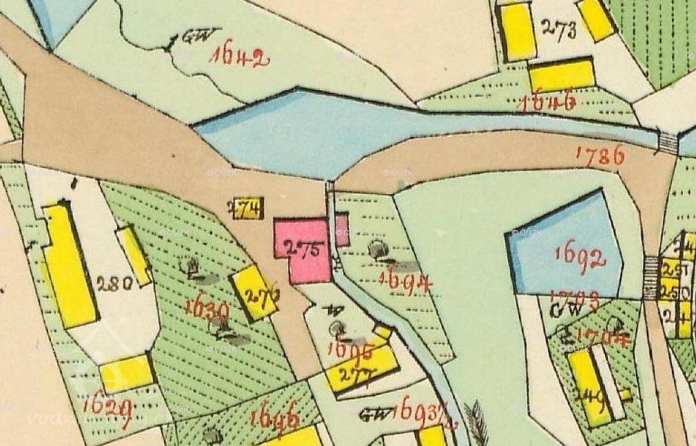 Mlýn stál pod velkým rybníkem, táhnocím se k Dolnímu Bousovu (HŠ).