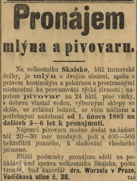 V roce 1877 koupil mlýn od Jana Kohout boleslavský advokát a majitel skalského velkostatku, zámku a cihelny Josef Alois Wurzel za 12 100 zlatých rakouské měny. Ve mlýně nechal postavit vodárnu, která čerpala vodu do dvora a do kašny na zámku. Mlynářská činnost zde však nezanikla, mlýn provozoval jako nájemce Josef Šmíd, mlynář původem ze Staré Vsi u Vysokého nad Jizerou. Bývalý mlynář Jan Kohout s manželkou Annou žili na mlýně dál na výměnku. (MH)