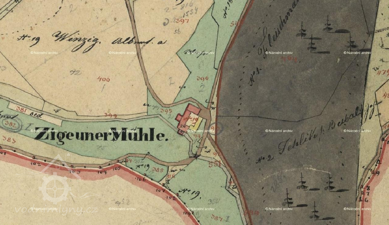 Skupina budov v katastrálním území Šumavské Hoštice,zobrazena na mapě Stabilního katastru :Čechy-7809-1 ,mapový list č.004.Jednalo se o následující objekty:-dům čp.19/st.p.26/1-"obydelní a mlýnské stavení",obytný domek čp.35/st.p.26/2 a domkářskou usedlost čp.39/st.p.26/3.Při zákresu usedlosti do mapy Stabilního katastru/1837/ je ve skice uvedeno jméno tehdejšího vlastníka: " No.19-Winzig/Zigeuner/Albert".K rozdělení stavební parcely č.26 došlo před r.1875. K vlastnictví mlýna: