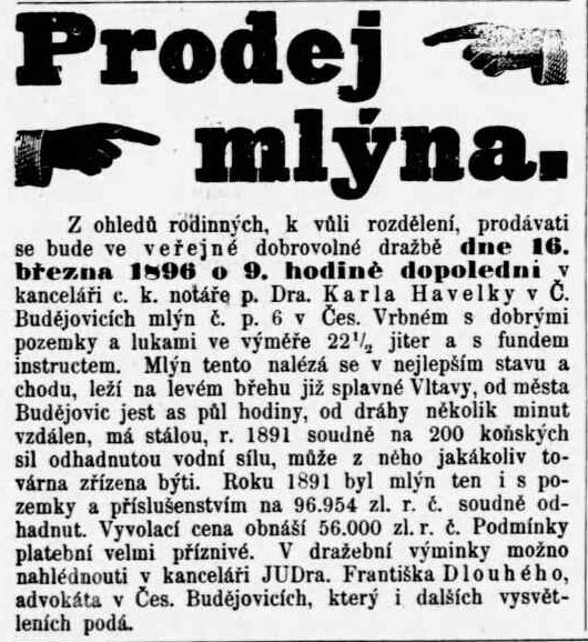 1891 - soudně na 200 k. s. odhadnutou vodní sílu a na cenu 96 954 zlatých (PK)