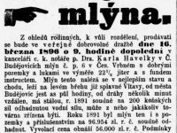 1896 - dle inzerátu (viz. sekce Ikonografie) tehdy mlýn "s dobrými pozemky a lukami ve výměře 22 1/2 jiter a s fundem instructem" (PK)