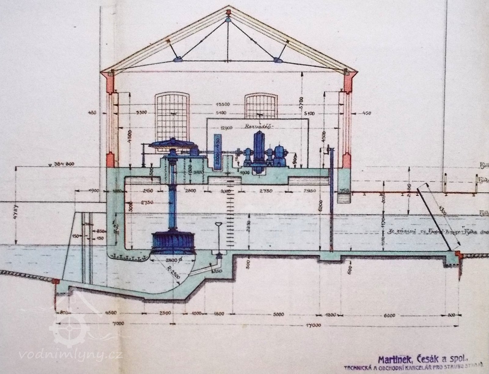 Popispo 1921 2 Francisovy turbíny Union po 168 HP (hltnost 2 x 10 m3/s, spád obou 2,1 m)