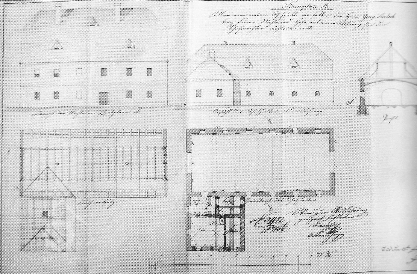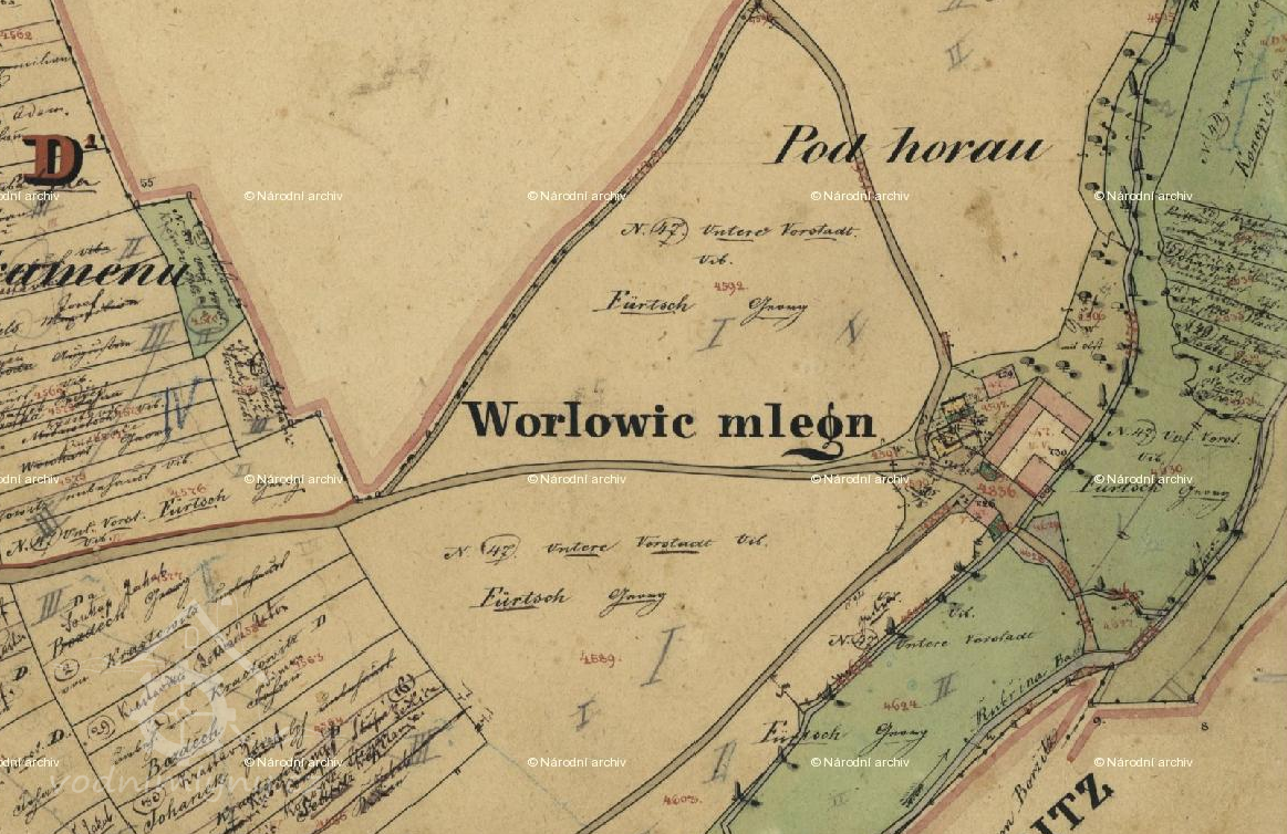 25.10.1877 byl u mlýna zasazen vodní cejch na dubovém kůlu. Majiteli mlýna byli Georg a Franziska Fürtschovi. Mlýn se tehdy stále ještě jmenoval Vorlův jak je zaznamenán už na mapách stabilního katastru. Fürtschovi byli Němci, proto byl protokol jako u jediného z deseti domažlických mlýnů sepsán německy. Mlýn tehdy obsahoval dvě česká složení poháněná dvěma koly o průměrech 3.4 a 3.3 m.