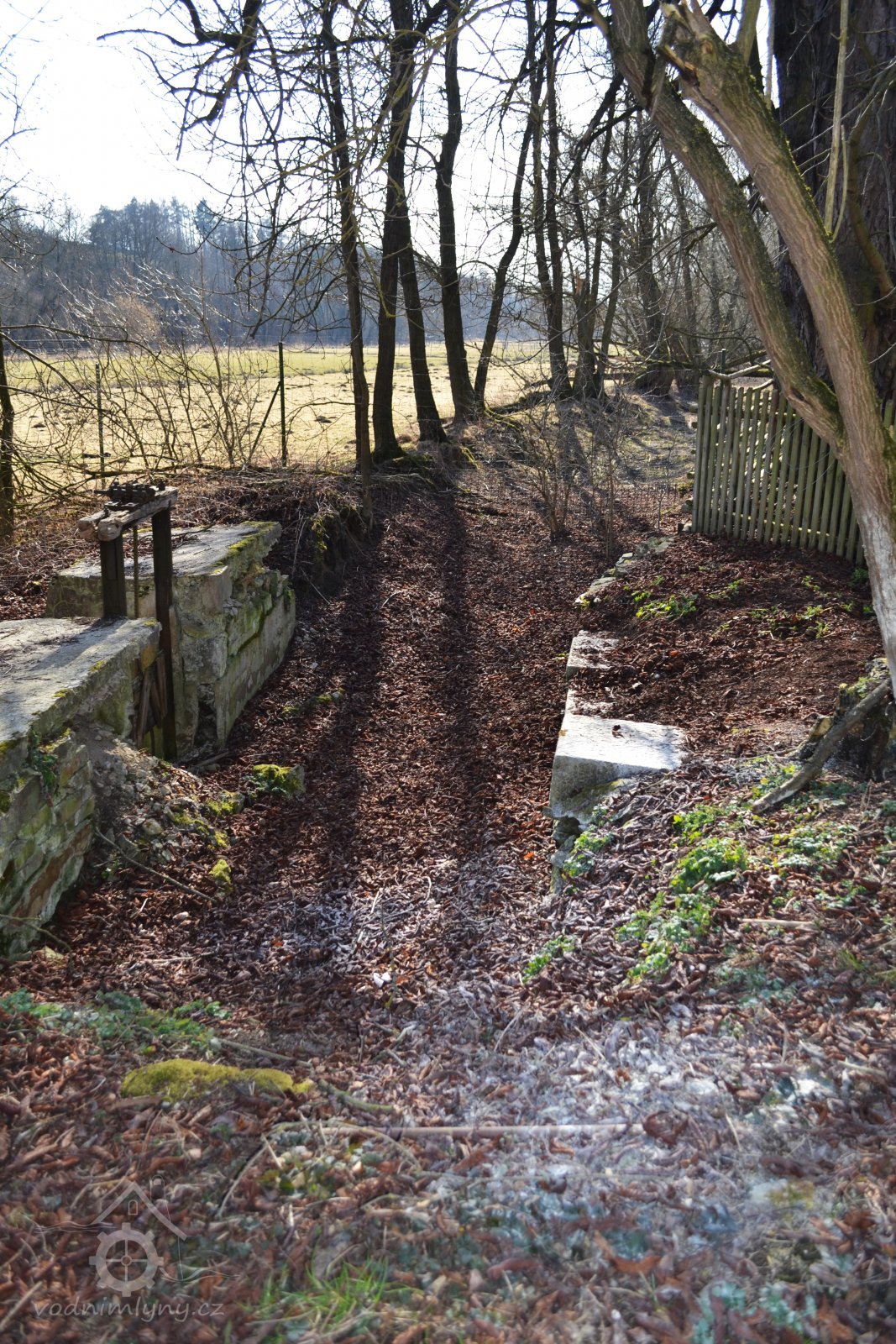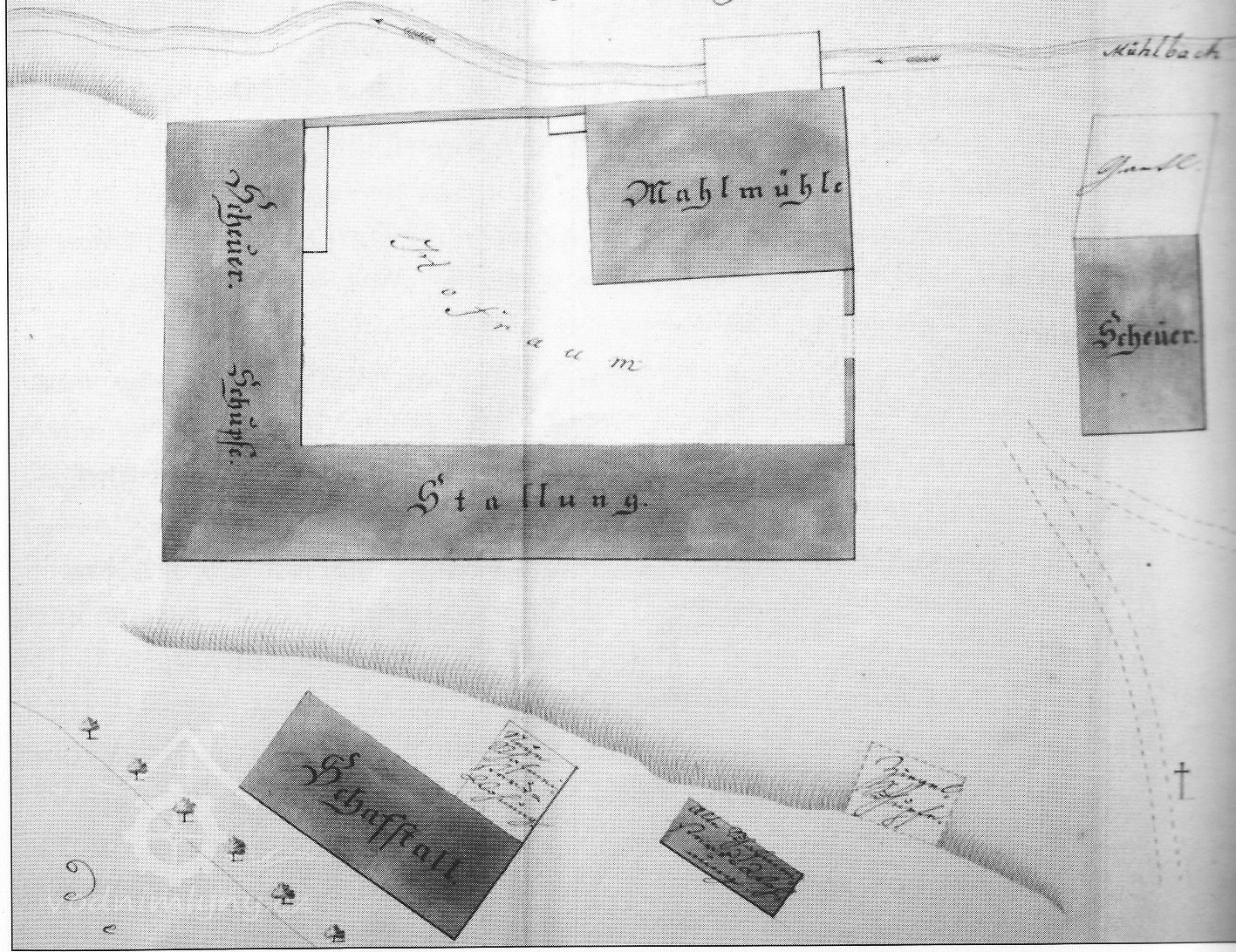 Mezi mlýnskou budovou a navazujícím hospodářským objektem, který je jedinou stavbou, postavenou až po roce 1838, je krátká proluka. Následující stavby jsou již založeny na starém půdorysu. Na severu to jsou stodoly, jejichž krov je datován rokem 1834. Západní stranu uzavírají stáje a chlévy překryté plochými klenbami do pasů, z nichž vede vstup do rozlehlého podzemního sklepa. Větrací otvory tohoto sklepa jsou obloženy mlecími kameny. V jihozápadním nároží tohoto křídla je vystavěn obytný objekt, využívaný k ubytování mlýnské chasy (dnes přestavěno na hostinské pokoje a zubní laboratoř). Na prostorný dvůr se vstupuje brankou pro pěší, popř. vjíždí branou uzavřenou kovovými mřížovými vraty, jejichž závěsy jsou zasazeny do pilířů, které vrcholí kamennými profilovanými deskami s koulemi. Kolem uzavřeného areálu jsou položeny další hospodářské objekty. Z objektů, které zde stály již před rokem 1938, je to stodola před vjezdem do mlýna. Bývalý ovčín při západní straně mlýnského areálu byl zbořen a později nahrazen domkem, kolem nějž se dnes rozkládá zahradnictví. Nad mlýnem, při staré cestě, stojí mlynářský křížek, datovaný na kamenném podstavci 1856. Na plaketě litinového kříže: "Přijďte ke mně všichni, kteří trpíte a obtíženi jste. Já vás občerstvím. Věnovali Amálie a Jiří Fürtschovi 1856-1907. Obnovila rodina Vochocova 1977".