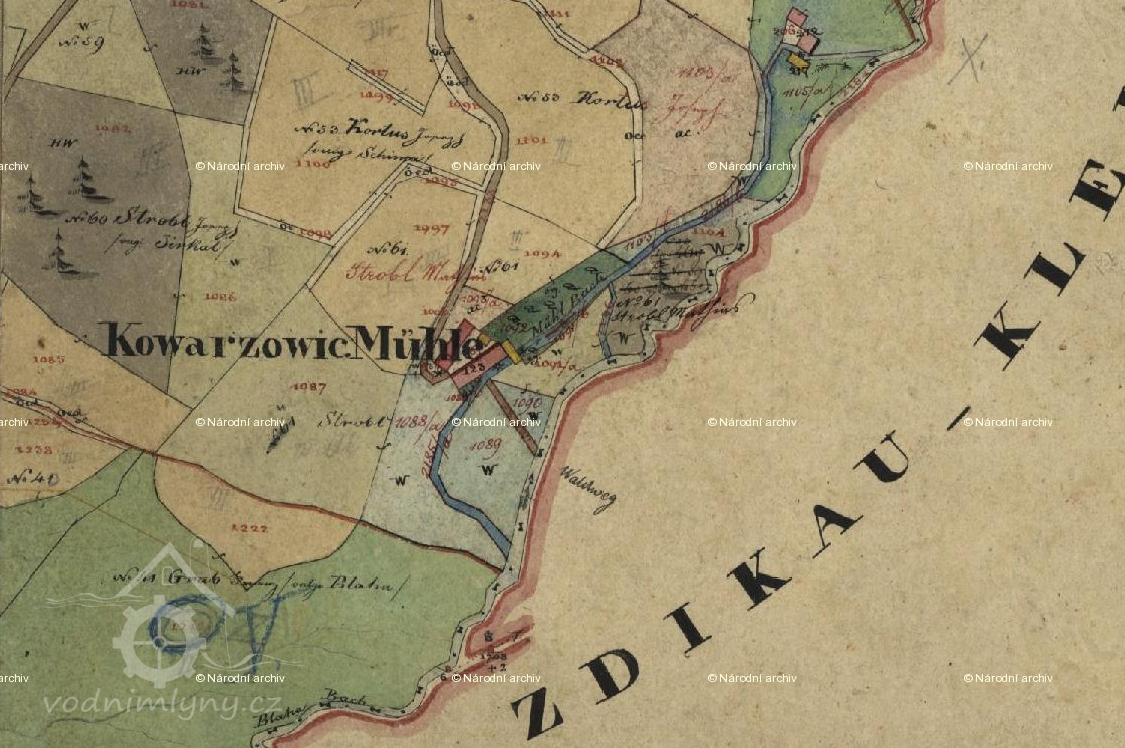 Popis1886: 2 kola na svrchní vodu, prům. 4,8 m, pilu pohánělo kolo o prům. 5,8 m, čistý spád 13,5 m.