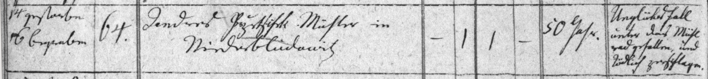 1798 tragická smrt mlynáře Andrease Przeczka, věk 50 let. Příčina smrti: Unglückfall - unter das Mühlrad gefallen und tödlich geschlagen (nešťastný pád - pod mlýnské kolo padlý a smrtelně raněn.)