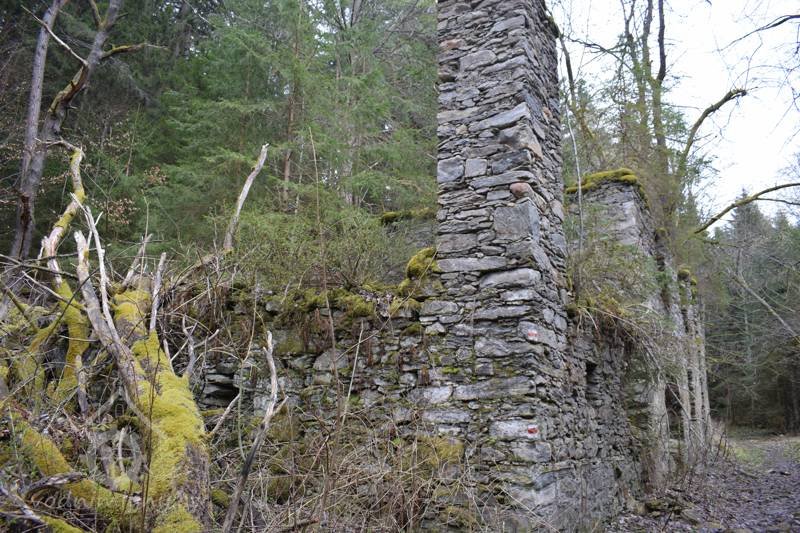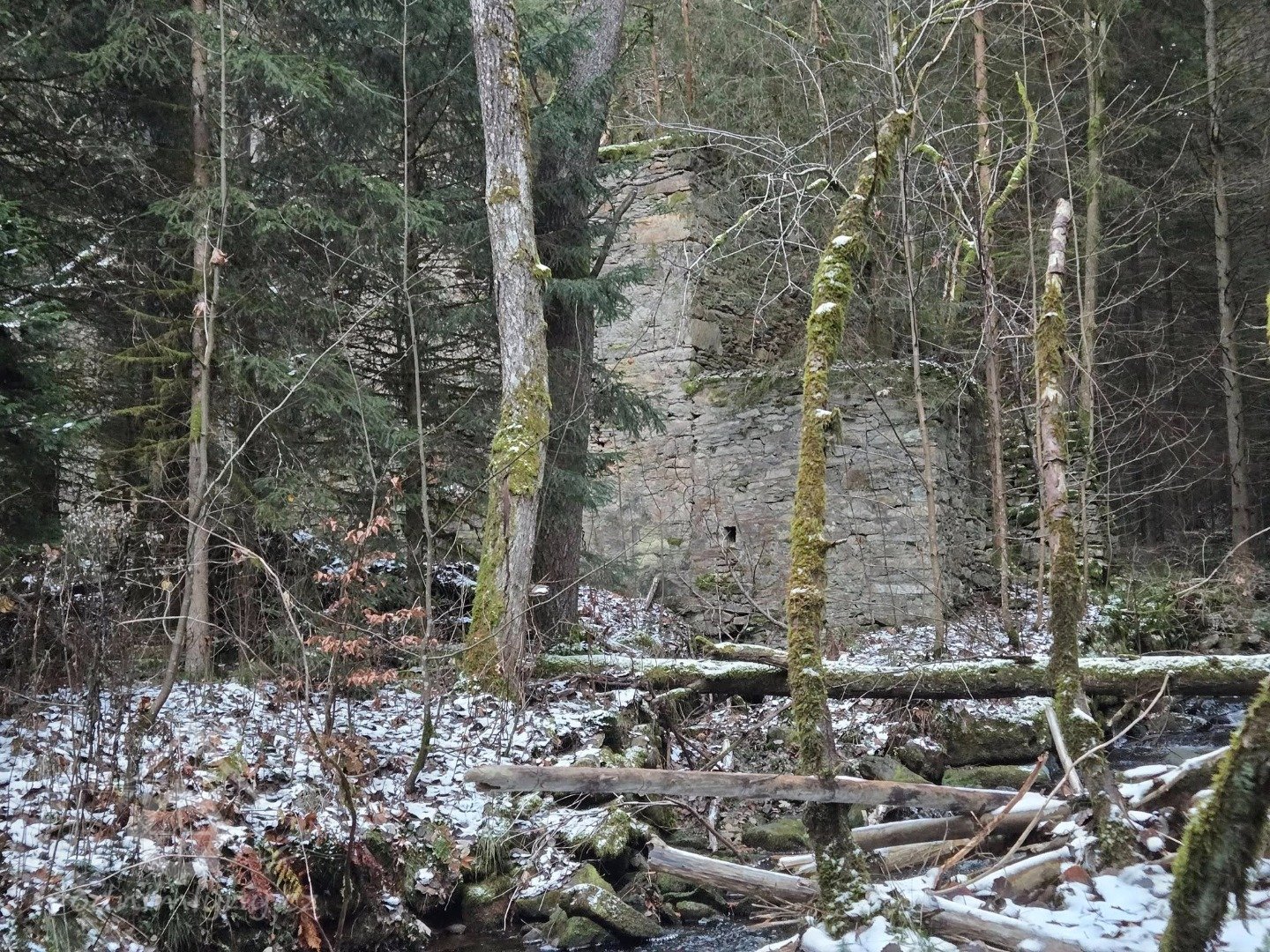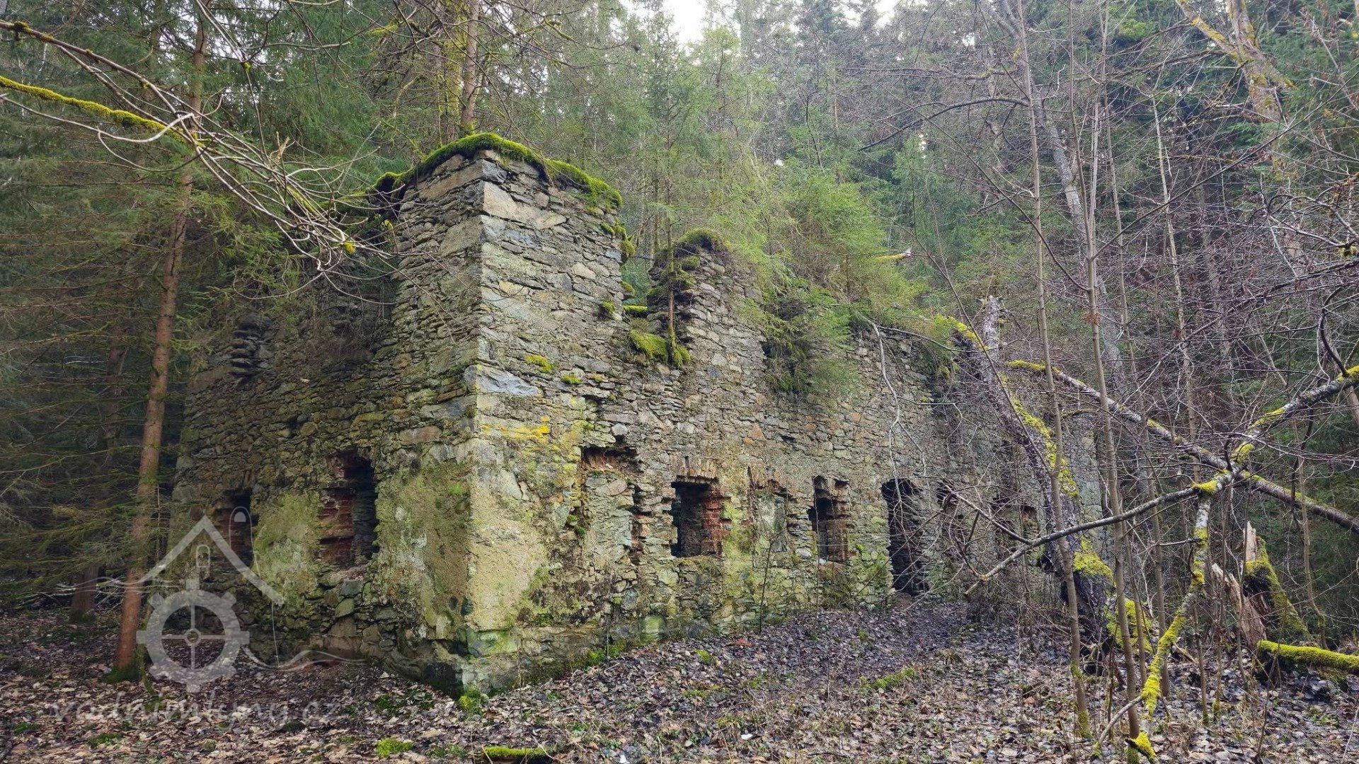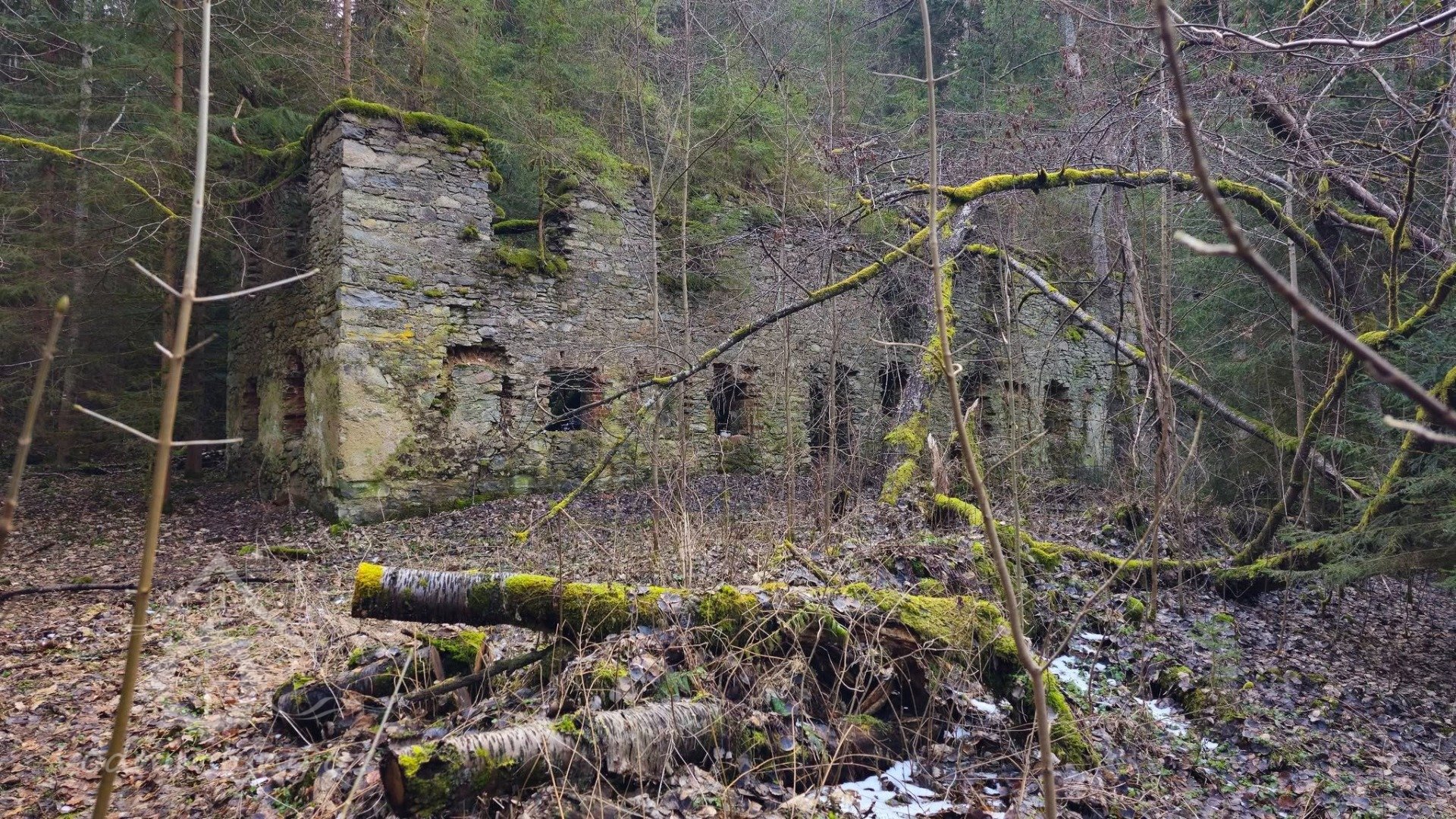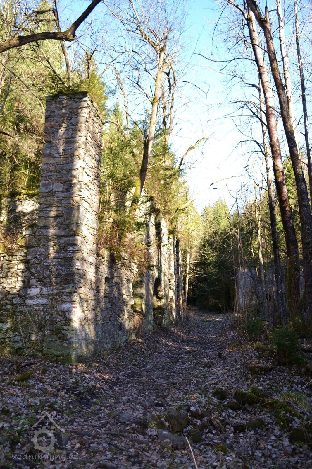 Mohutné zříceniny budov sirkárny, mlýna, pily a nedaleké elektrárny.