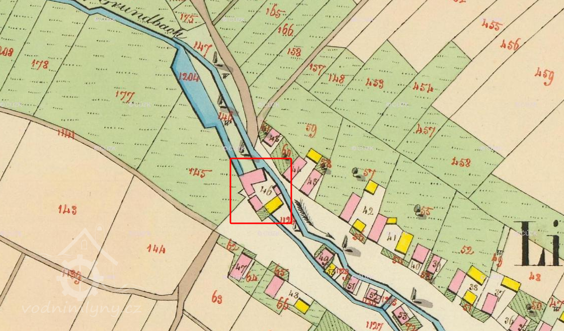 PopisV r. 1930 zde byla 2 kola na svrchní vodu, průtok 0,088 m3/s, spád 4,19 m, výkon 6,4 k.