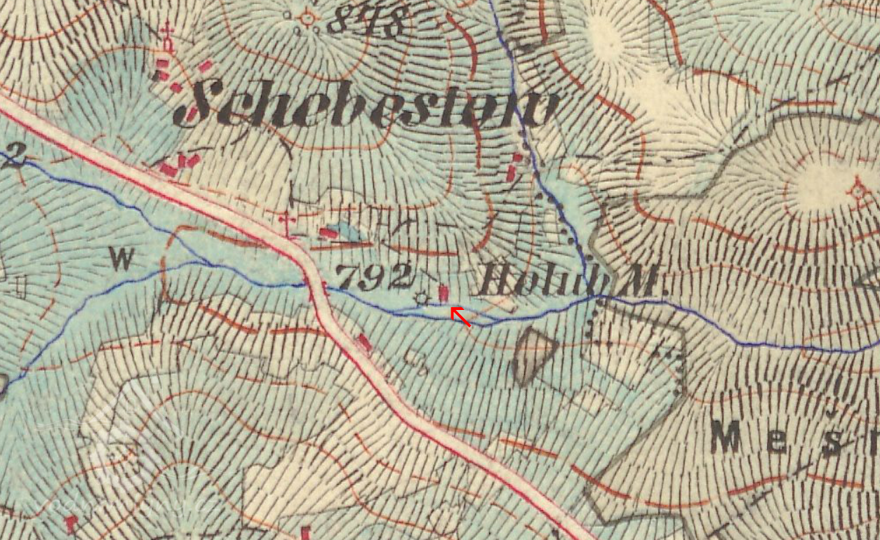 Na mapě II. vojenského mapování je mlýn označen jako "Holubova skelná huť", jedná se patrně o chybu mapovatele, nejsou známy záznamy o existenci hutě v oblasti Šebestova, objekt je jako mlýn navíc uváděn na všech mapách před i po II. voj. mapování.