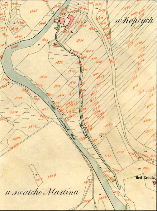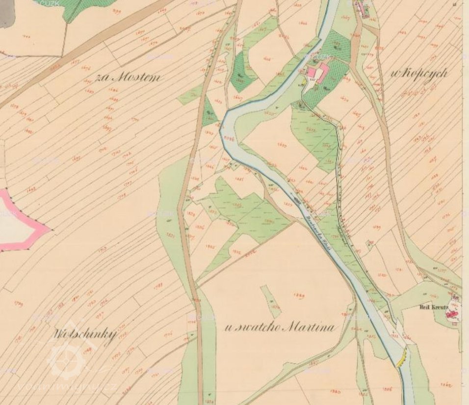 "Pod sv. Martinem zadržuje její vodu splav, od kterého vytéká náhon ke Korečníkům. Pod sv. Křížem protéká voda náhonu Štůlou, prastarým tunelem vysekaným ve skále. Kdo jej dal vysekati a kdy není známo. Jen pověst vypravuje, že počátkem 14. století byli dva lapkové odsouzeni pány z Lichnice k smrti. Z výkonu trestu se však vykoupili slibem, že prokopou skálu pod svatým Křížem, aby mlýn Korečníky, který patřil k majetku pánů z Lichtenburka měl stálou vodu. Dlouhá léta prokopávali skálu ze dvou stran proti sobě. Jeden z nich se trochu odchýlil od původního směru, takže když se setkali, vznikl ve spojené části výklenek. Štůla je 70 m dlouhá, 2 m vysoká a široká."