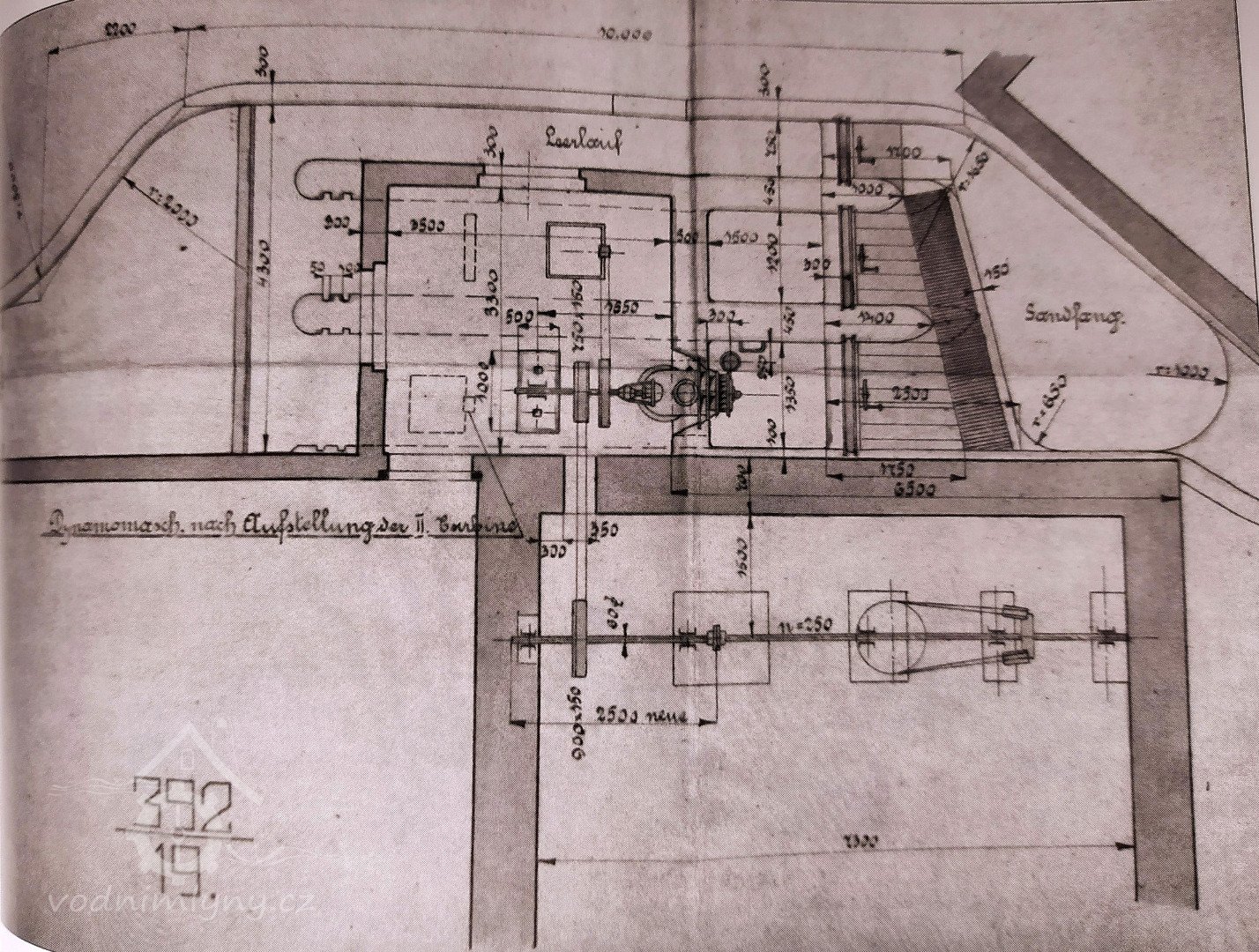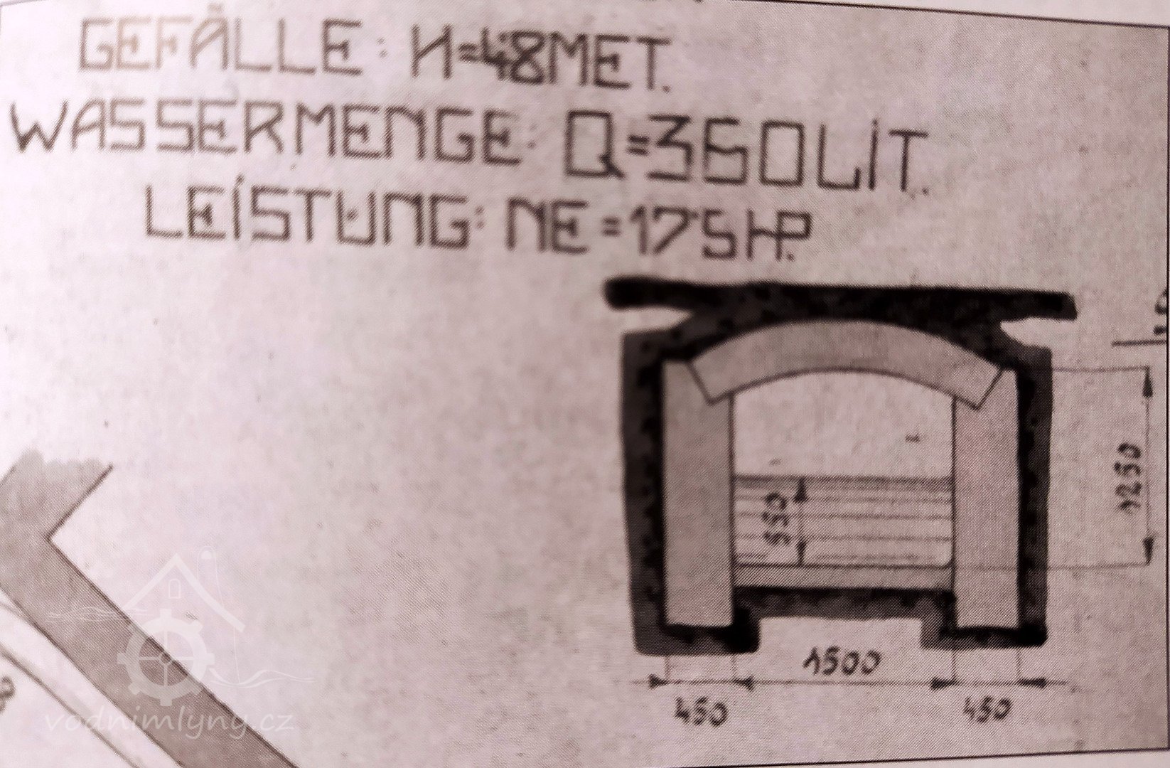 Popis1930: 1 turbína reakční, hltnost 0,16 m3/s, spád 5,5 m, výkon 8,7 HP