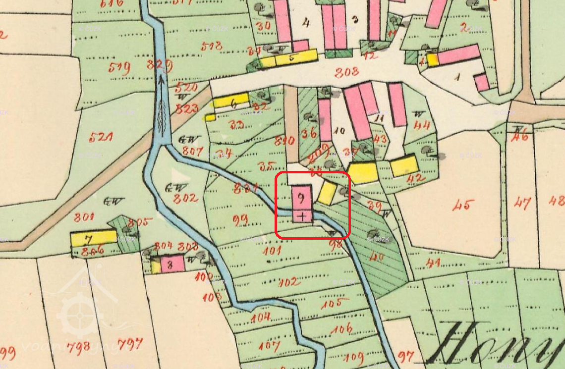 1933: voda vzdouvána stavítkem 70 cm širokým a 51 cm vysokým na Bližanovském potoce, náhon 400 m dlouhý, široký 2 m, hluboký 0,6 m, před vantroky se rozšiřuje na 7 m. Vantroky 3,10 m dlouhé, betonové, šířka 1 m, hloubka 0,77 m, na konci zřízeno závodní stavítko, dřevěné dvoudílné, pravý díl o šířce 53 cm a výšce 69 cm slouží k pouštění vody na kolo, levý 40 cm široký a 71 cm vysoký slouží k odlehčování přebytečné vody do vodní komory. Pomocí kluze se voda přivádí na kolo, odpadní stoka se spojuje s potokem 80 m po mlýnem.