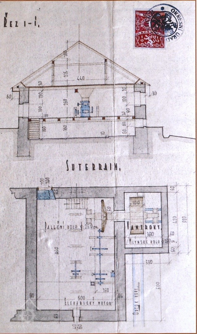 1930: 1 kolo na svrchní vodu, hltnost 0,12 m3/s, spád 3,5 m, výkon 3,64 HP, průměr 2,85 m, šířka 0,85 m, hloubka korečků 0,27 m