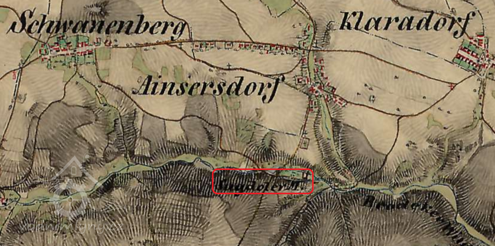 O tom, že v roce 1834 byl mlynářem Joseph Aberle svědčí tzv. indikační skica (MZA Brno), na které je uveden jako držitel mlýna a okolních pozemků, viz: