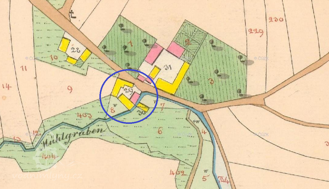 Popis1930: 1 kolo na svrchní vodu, hltnost 0,08 m3/s, spád 6,17 m, výkon 4,2 HP