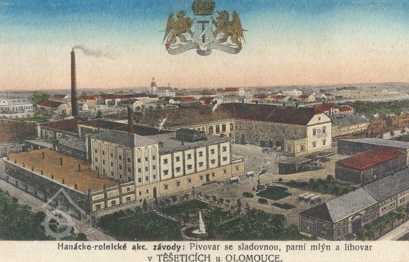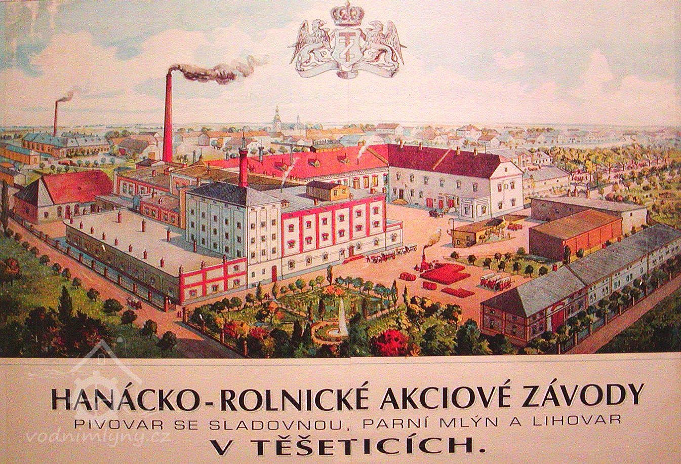 Vybudován 1897-1898, areál začali stavět bratři Koudelkové, dostali se do finančních potíží a snažili se jej prodat. V roce 1897 začal s bratry jednat Rolnický akciový pivovar v Litovli. Jenže valná hromada, která se konala 9.12.1897 celou transakci zamítla. V zápětí na to byla do obecního hostince v Těšeticích svolána schůze zástupců obcí těšetického okolí s cílem, utvořit akciovou společnost, která by odkoupila pivovar a přidružené závody – mlýn, lihovar, palírnu, hospodářské budovy v úhrnné ceně 200.000 zlatých.