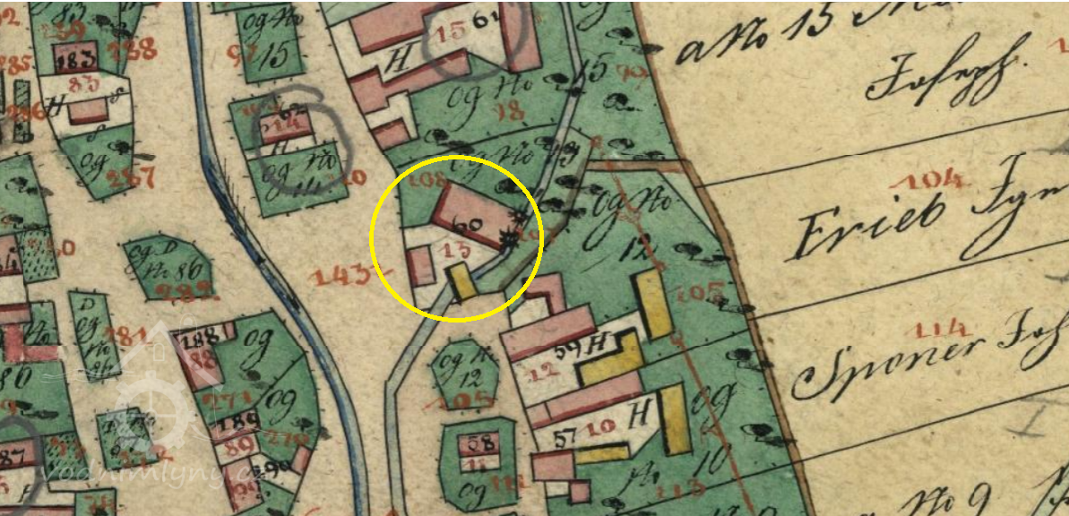 Popis1930: 1 kiolo na svrchní vodu, hltnost 0,103 m3/s, spád 2,95 m, výkon 2,25 HP