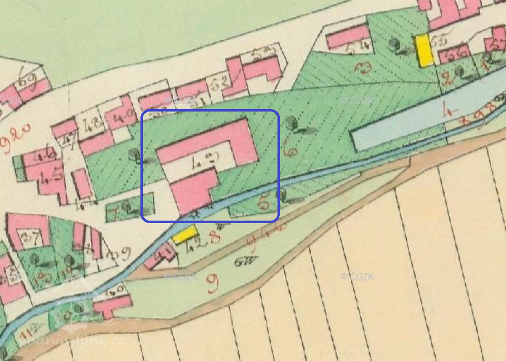 Popis1930: 1 kolo na svrchní vodu, hltnost 0,138 m3/s, spád 5,8 m, výkon 6,15 HP
