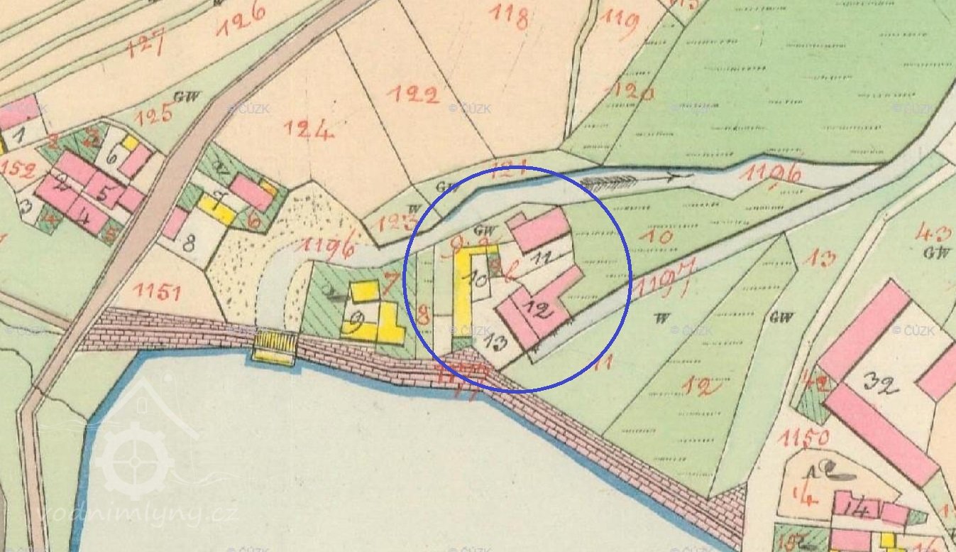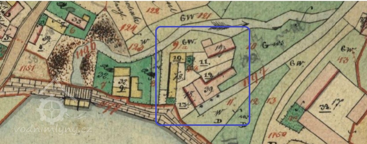 Popis1930: 3 kola na svrchní vodu, hltnost 0,25, 0,11 a 0,166 m3/s, spád u všech 4,2 m, celk. výkon 12 HP