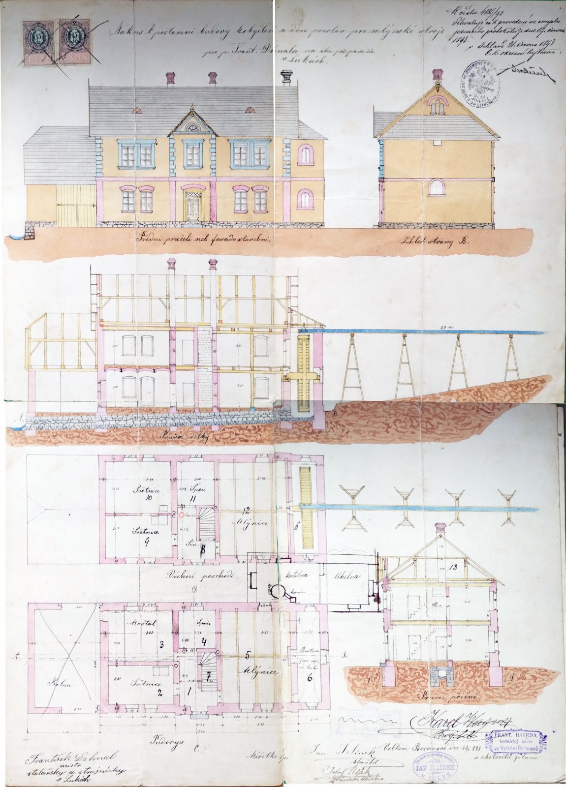 Bylo vypočítáno, že mlýnský náhohon dosáhne od Kozlovského potoka spád okolo 8 metrů, mlýnské kolo mělo mít průměr také 8 metrů. Většinu ze strojního vybavení si František Dohnal vyrobil sám, protože dříve pracoval v Pardubicích v továrně na výrobu dřevěného mlýnského zařízení. Pocházel z nedalekých Bítovčic, byl vyučený stolař a strojník a v posledních letech se živil také jako hostinský (U Korandů na městečku). V Lukách si namluvil Magdalenu Vondrovou, dceru sedláka Jana Vondry z čp.85. Měli spolu 6 dětí, avšak všechny zemřely do 6ti let věku. Později si vzali na vychování tři sirotky (Stokláska z Jamného, Lojka z Jihlavy a Karlu Kejnovskou, provdanou Balvínovou z Přibyslavic).
