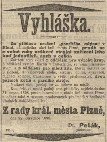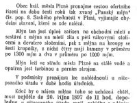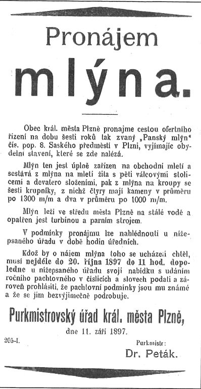 V letech 1400 - 1420  byly v Plzni  čtyři mlýny, největší tzv.Veliký mlýn o deseti složeních před Pražskou bránou, později zvaný Panský.(HŠ)