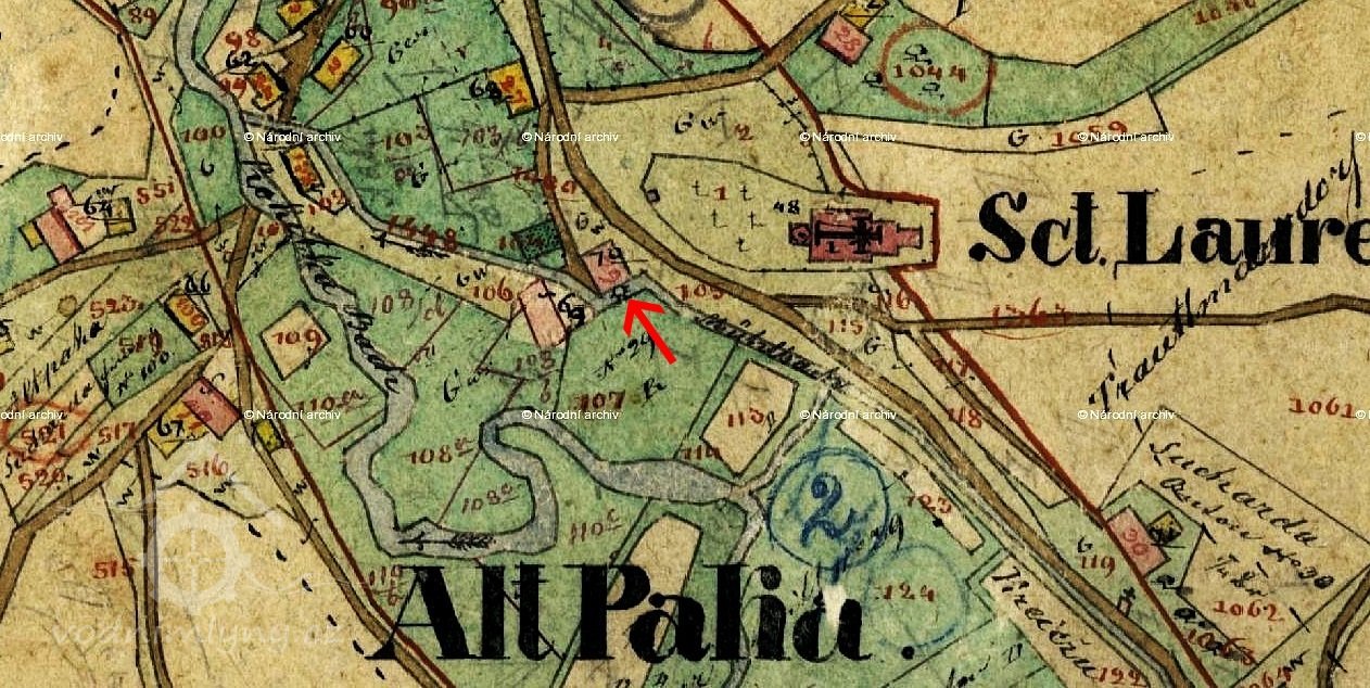 Mlýn se nacházel asi 80 m jihozápadně pod kostelem sv. Vavřince.