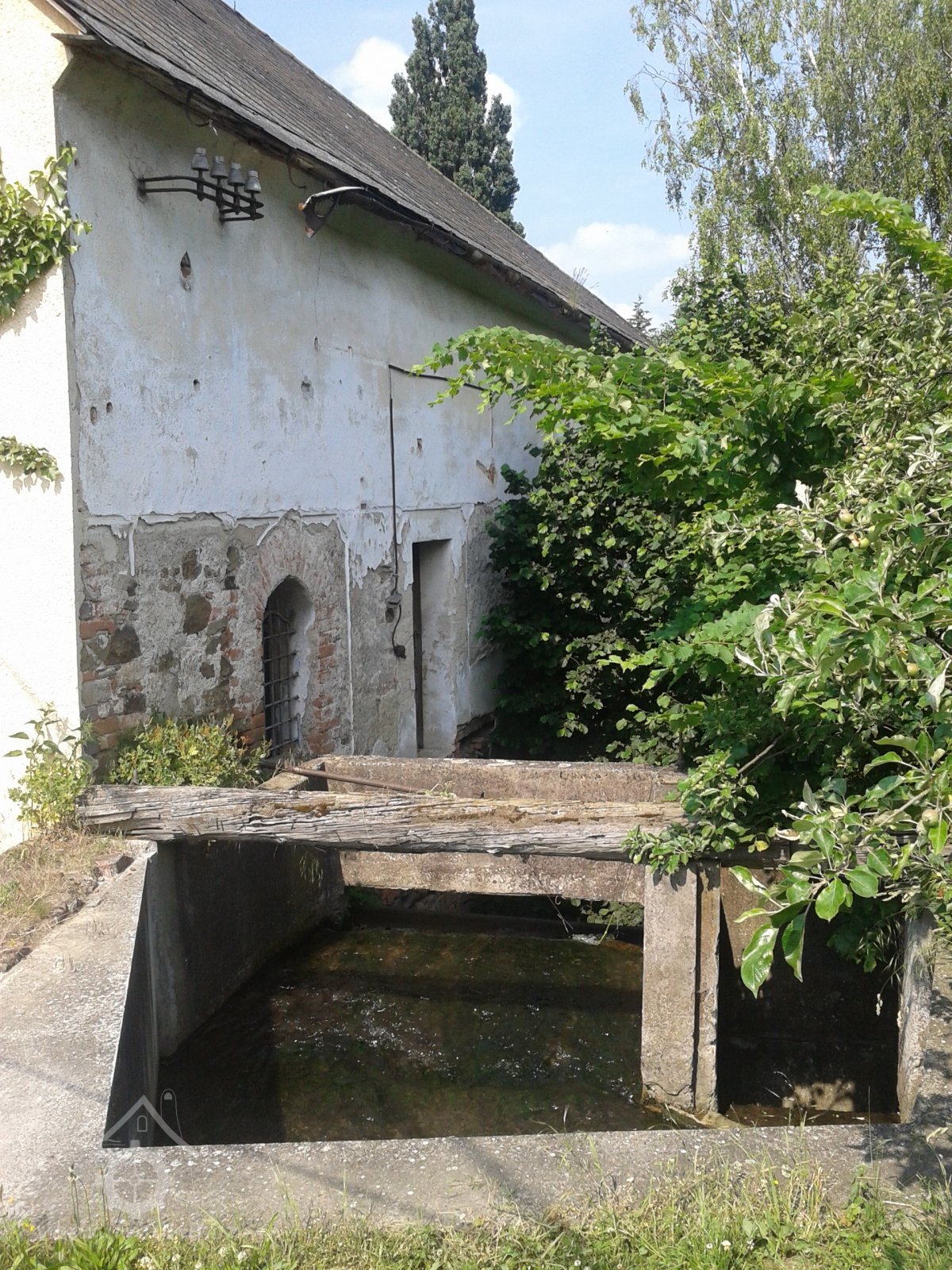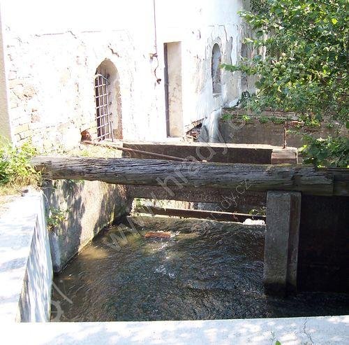Bývalý vodní mlýn, poháněn vodou shora na Mlýnském potoku, který je upraveným původním pravým ramenem říčky Hloučely.