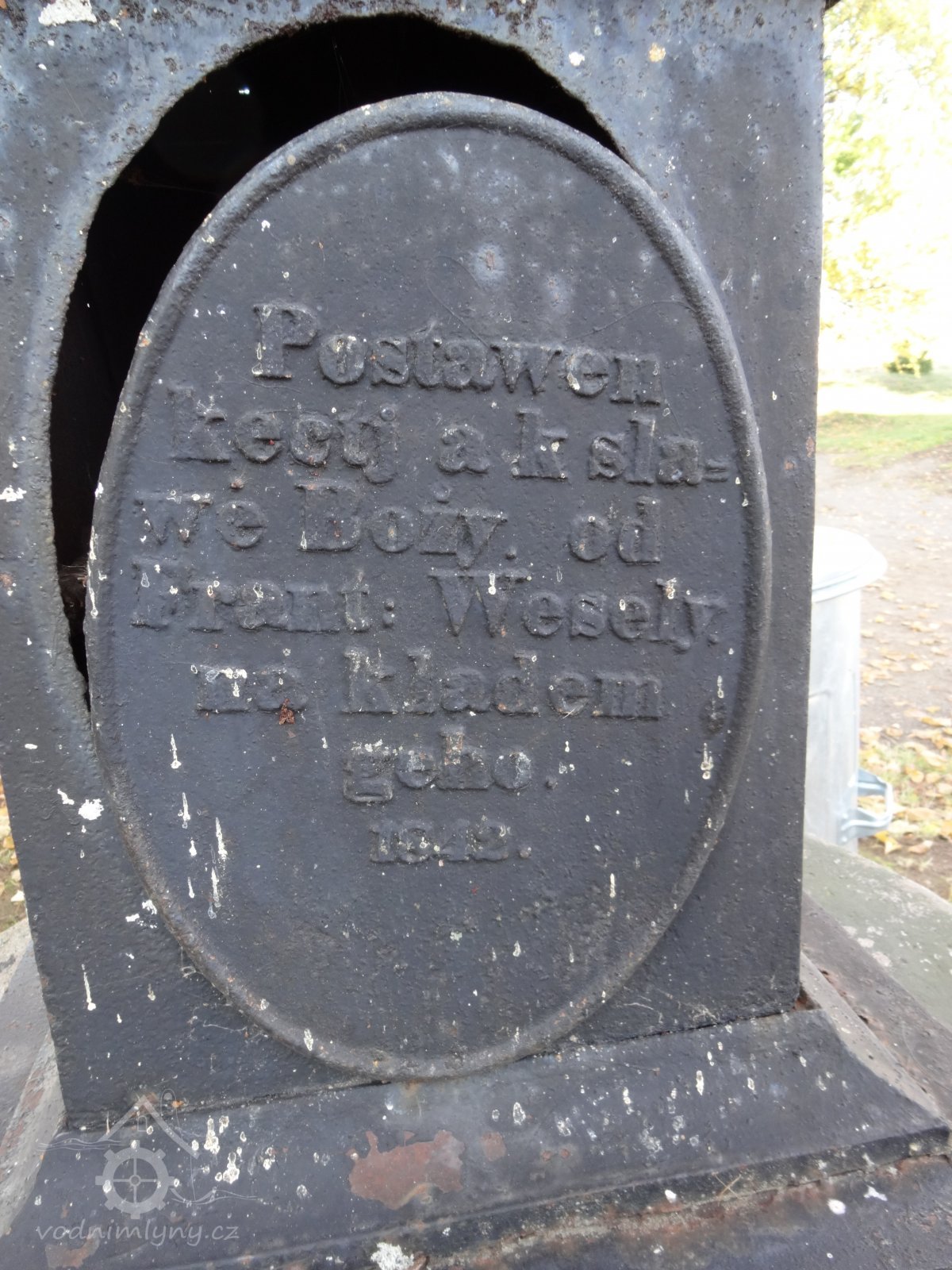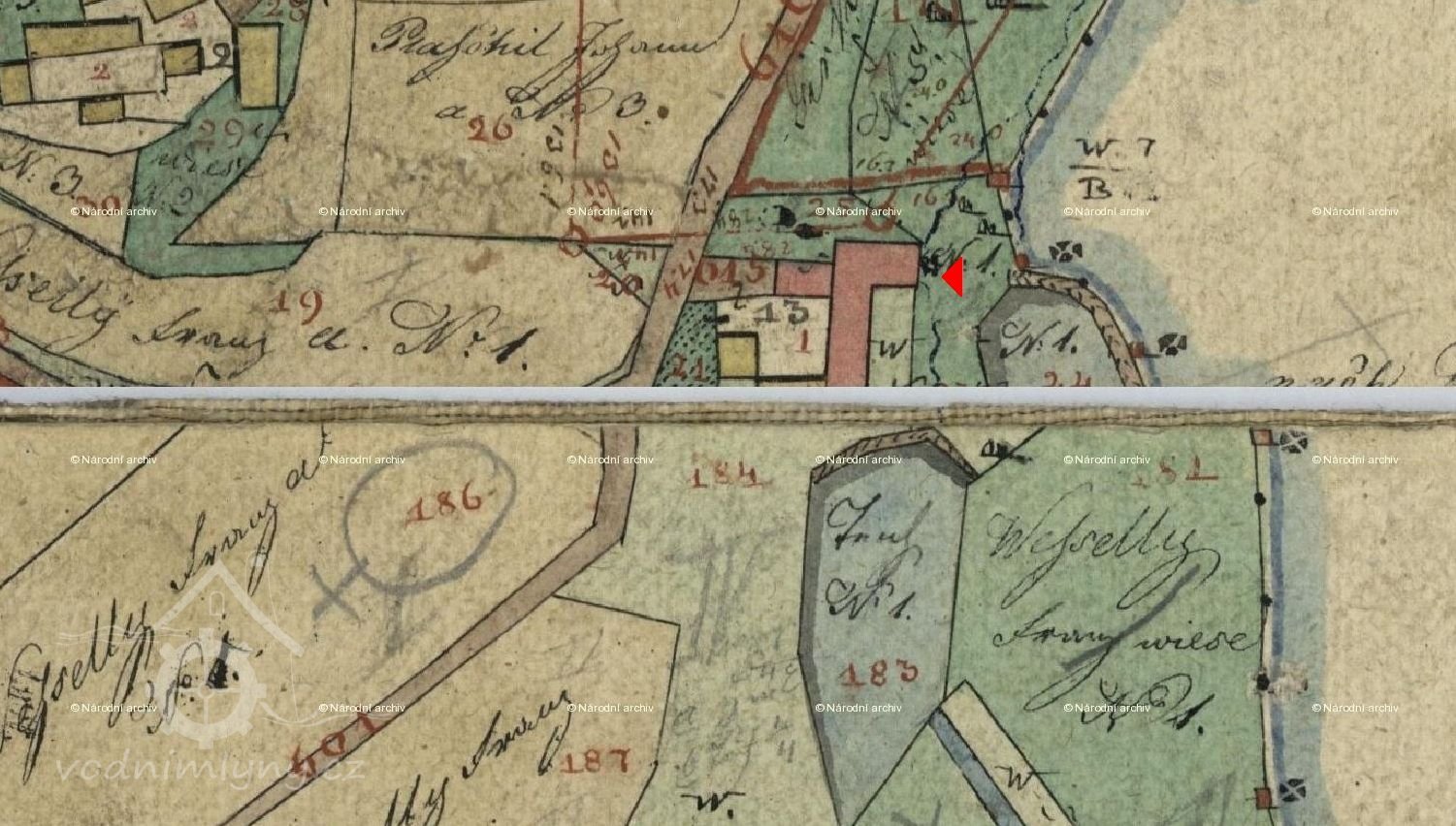 Vodoprávní řízení. Mlýn čp.1 zde stával odedávna. Rodiče manželky mlynáře koupili mlýn v r. 1880 a tehdejší mlynářka Veselá tvrdila, že hospodaří na mlýně již 60 let. Vodní kolo průměr 4,9m, šířka 0,83m, 8ot/min, průtok 160litrů/s, výkon 8HP. Voda přitéká od rybníka nad mlýnem do druhého rybníku sloužícího jako nádržka, následně pak korytem 30cm vysokým, 60cm širokým přes stavidlo na vantroky.