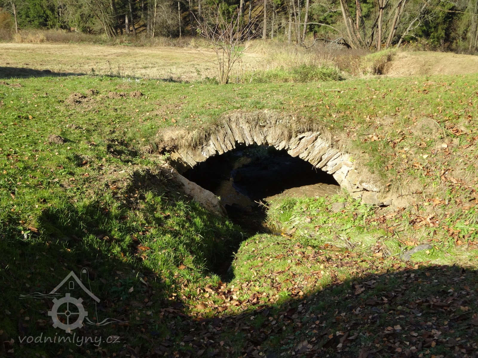Potřebná se voda přivádí mlýnskou strouhou, do níž se nahání přepadním jezem z potoka asi 20 minut cesty nad mlýnem. Na počátku mlýnské strouhy je u jezu stavidlo o 1 okenici. Mlýnská strouha se u mlýna rozšiřuje v malou nádržku. V hrázi nádržky jsou dřevěné vantroky opatřené na straně rybníka stavidly. Vantroky jsou 4 m dlouhé a 50 cm vysoké. Z vantrok jde voda 3 žlaby na kola. Odpadní voda od kol se spojuje pod mlýnem s jalovým potokem.