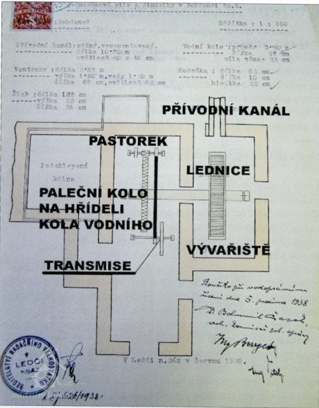 1938: Vodní kolo: průměr 5,40 m, šířka mezi věnci 82 cm, šířka celk. 97 cm, síla věnce 23 cm.
