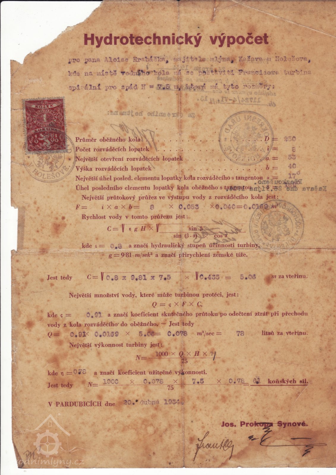Popis1930: 1 kolo na svrchní vodu, hltnost 0,09 m3/s, spád 5,05 m, výkon 4 HP