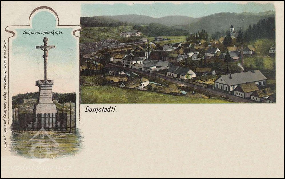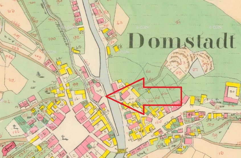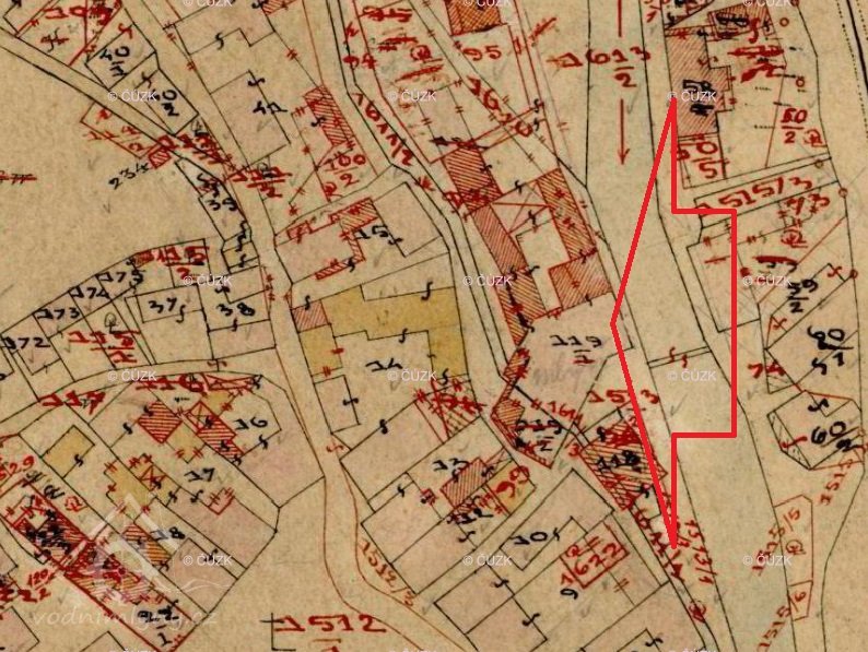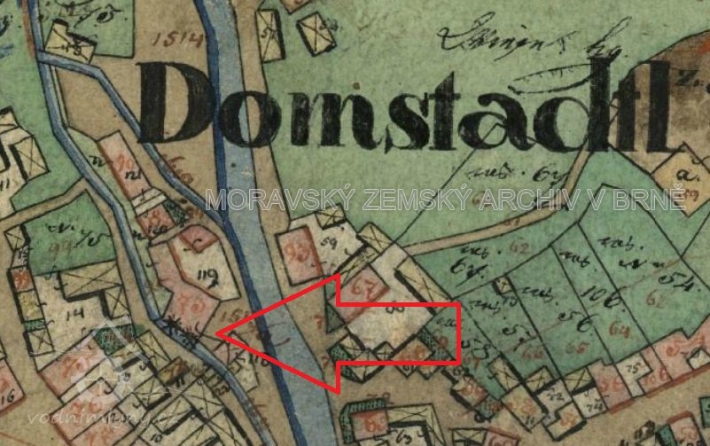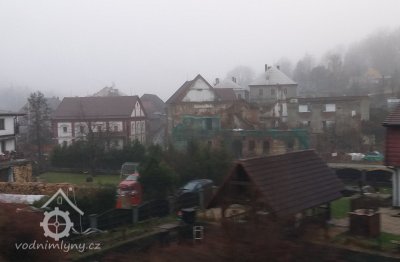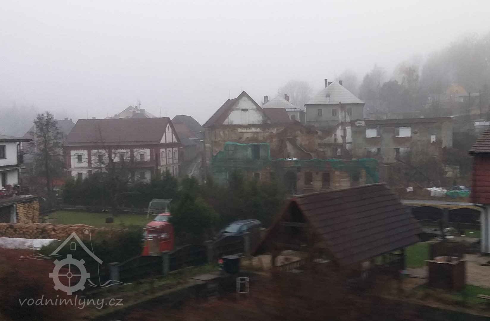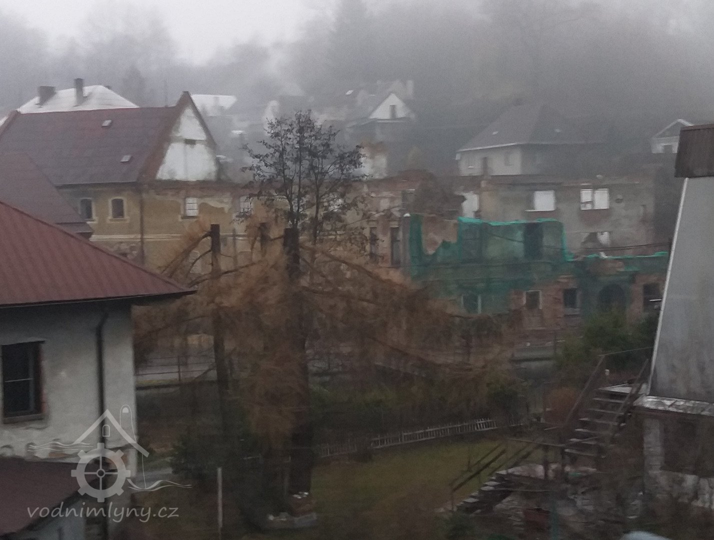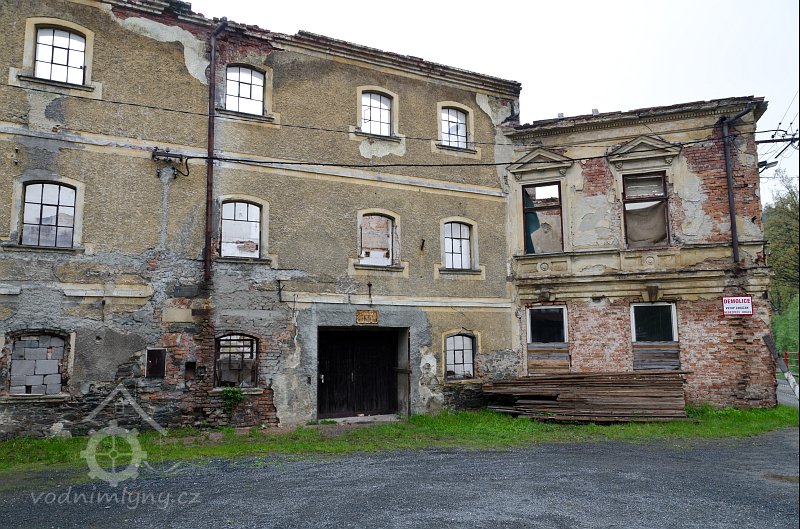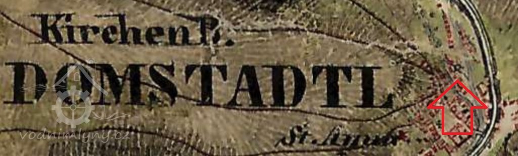 Nad Domašovem nedaleko vrtu kyselky pod železniční tratí se nachází dodnes patrný jez, náhon se zde odpojuje vpravo a vede podél náspu trati, kterou po pár stech metrech podchází pod mostkem, koryto pokračuje ve svahu a dodnes je lemováno vzrostlými stromy, před mlýnem byl vlevo odcházející jalový žlab. Voda se za mlýnem u sýpky vrací hned zpět do řeky.