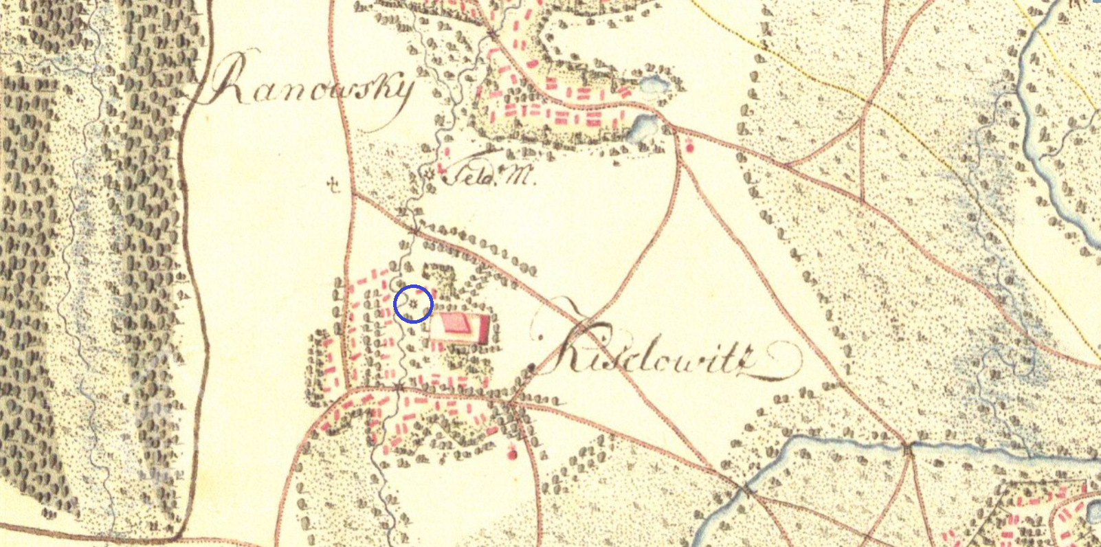 250 m severně od kostela sv. Andělů strážných v Kyselovicích