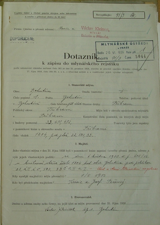 Nejstarší zpravidla bývá dotazník k zápisu do mlynářského rejstříku, vyplňovaný převážně v červenci roku 1939, výjimečně později. Pokud se v uvedenou dobu měnil majitel objektu, stává se, že jsou zde i zprávy ranější, převážně o změnách na strojním vybavení. Dotazník je předtištěný, má na dvaceti stranách dvacet tři částí. V úvodu jsou uvedeni majitelé objektu, od kdy mlýn vlastní, popřípadě od koho jej koupili. Jsou zde informace o tom, k jakému společenstvu mlynářů mlýn patří, kde je nejbližší železniční stanice, na jakých parcelách hospodářství s mlýnem stojí a výše námezdního a obchodního kontingentu mlýna. Dále se uvádí vodní právo, tok, na kterém mlýn stojí, včetně informací mezi jakými hodnotami se pohybuje průměrný průtok a síla vody v jednotlivých ročních období. Nechybí zprávy o výši vodní daně, zda je mlýn napojen na síť elektrické energie, kolik zaměstnanců ve mlýně pracuje a dopravní prostředky používané k živnosti. Dotazník udává i čísla o výši semletého obilí za rok1938 aza první polovinu roku 1939. Zmiňuje se také, kolik obilí a mlýnských výrobků se ve mlýně může uskladnit a kde. Nechybí stručný popis hlavní mlýnské budovy a budov pomocných, včetně stodol nebo chlévů. Někde jsou popisy strohé, jinde doplněné plánkem nakresleným od ruky. Pokud má badatel štěstí, je k popisu mlýna přiložena fotografie nebo celý plán mlýna. Hlavní částí je detailní popis vybavení, včetně rozměrů, značky stroje a roku výroby. První je popsán pohon mlýna, u kol a turbín jsou uvedeny rozměry, počty otáček za minutu, výkon a průtok v l/s, na který bylo kolo nebo turbína konstruováno. Dále jsou vyjmenovány stroje čistírny, mlecí stroje, vysévací a pomocné. V závěru jsou zmíněny další přidružené provozy, třeba pekárna nebo pila. Svou kolonku má ještě kapacita mlýna k 31. 10. 1939.