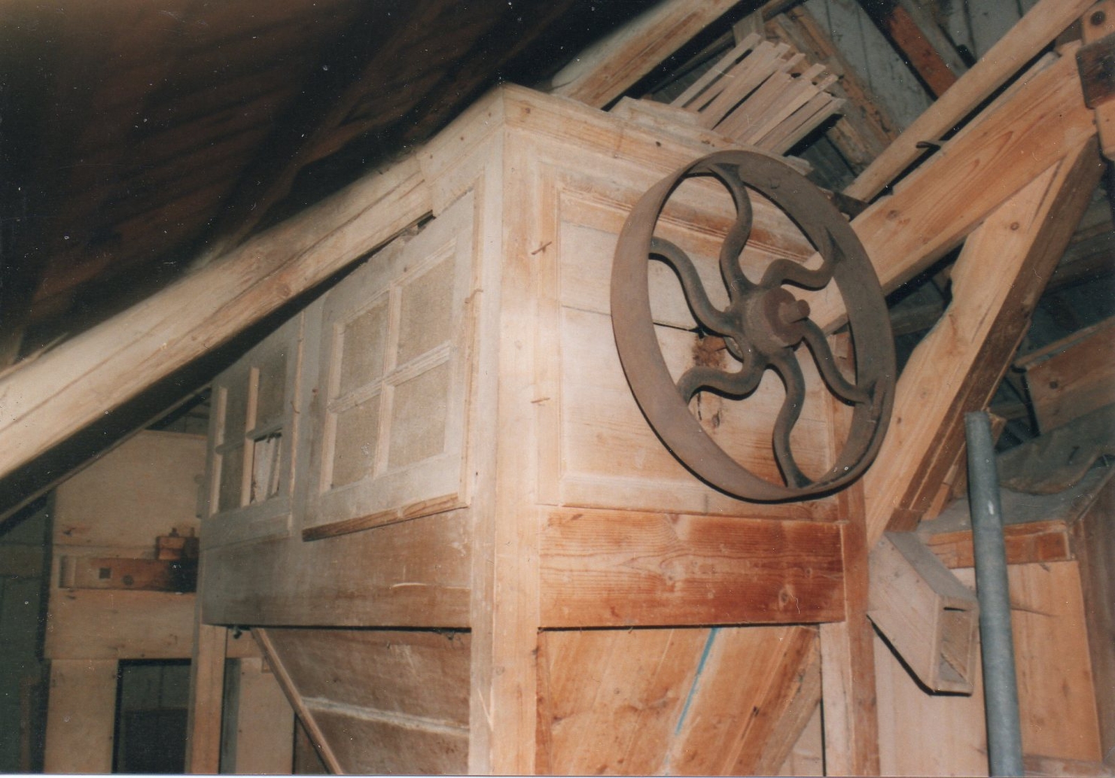 Zleva: moučný vysévač cca z r. 1910 – dolní mlýn v Roztokách u Semil čp. 40 (SM) zprava: hranol vysévače moučného bez sít – Rohův mlýn čp. 11 (PE), D. Veverka 2011.