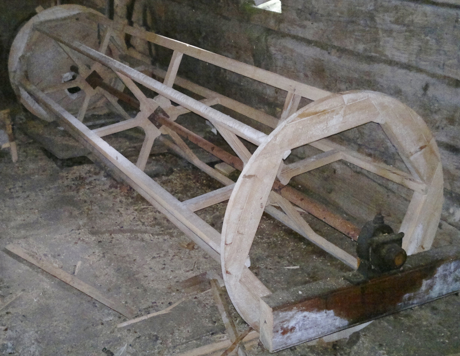 ♦ Konstrukce stroje bývá sesazena z dřevěných trámků a její provedení záleží na tom, zdali stroj visí u stropu, stojí na podlaze, či je v podlaze zasazený. Mezi konstrukcí je dřevěné prkenné opláštění, tvarem připomínající jakousi truhlu.