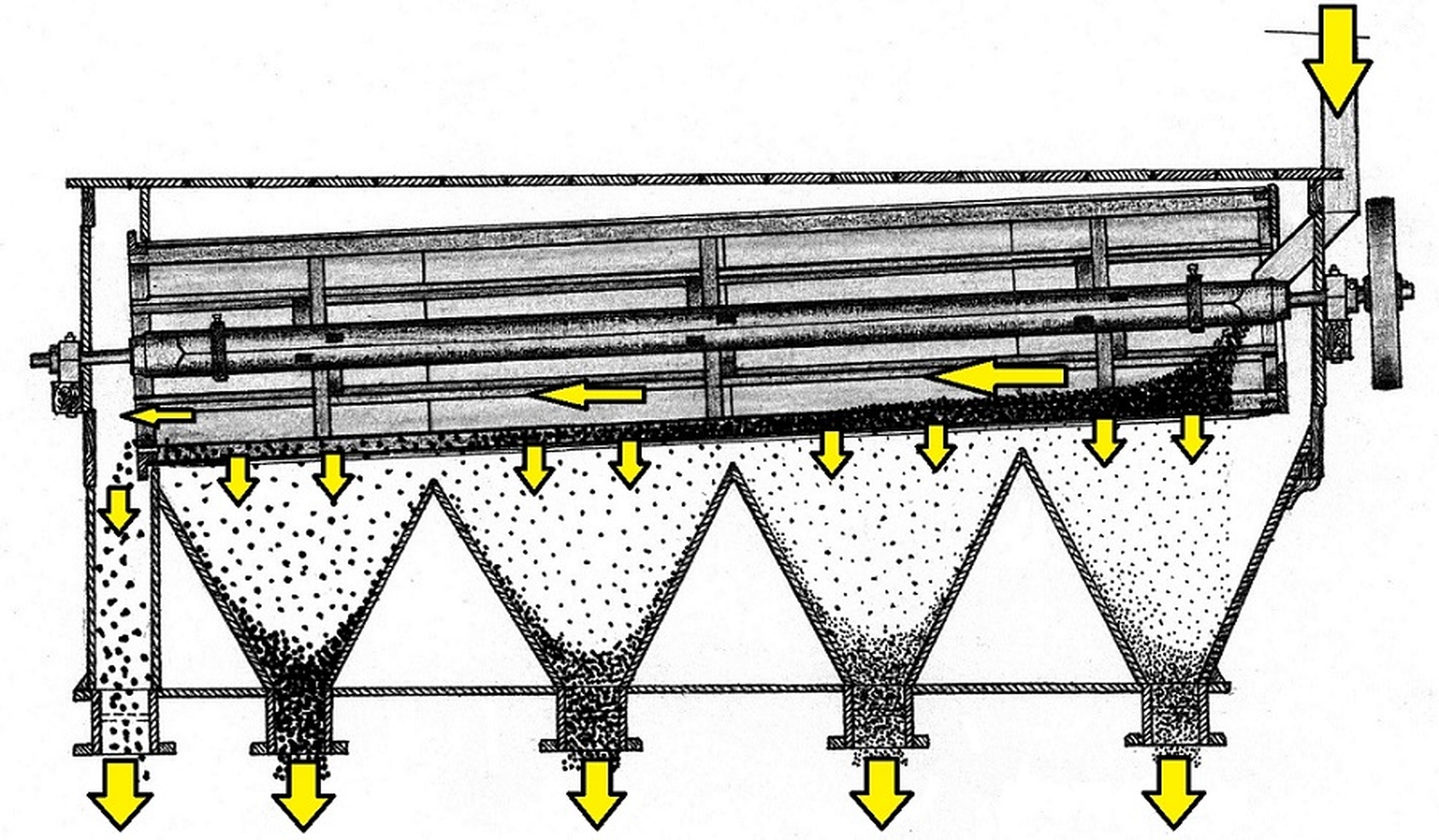 Předvysévač se šnekovým dopravníkem – obrázek z knihy Lehrbuch der Müllerei, G. Pappenheim, Wien 1903.
