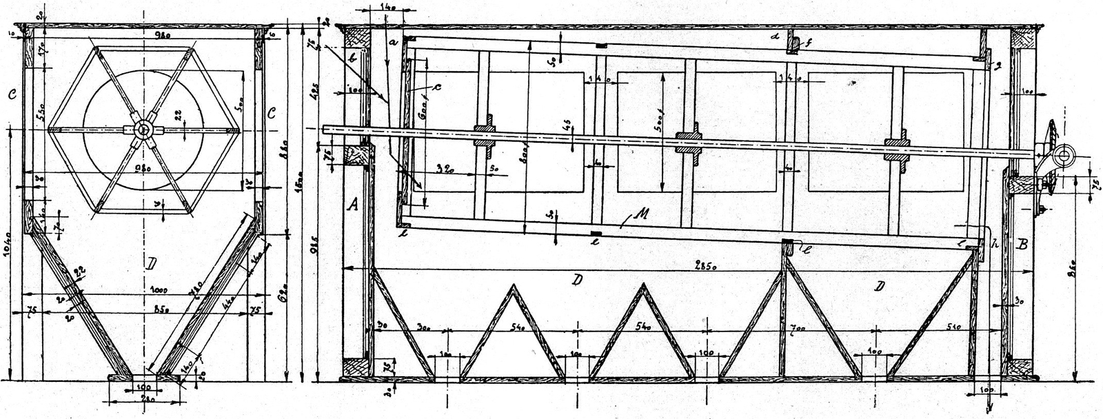 Předvysévač se šnekovým dopravníkem – obrázek z knihy Mlynářství a stavba mlýnů, Jaroslav  Karas, Praha 1923.